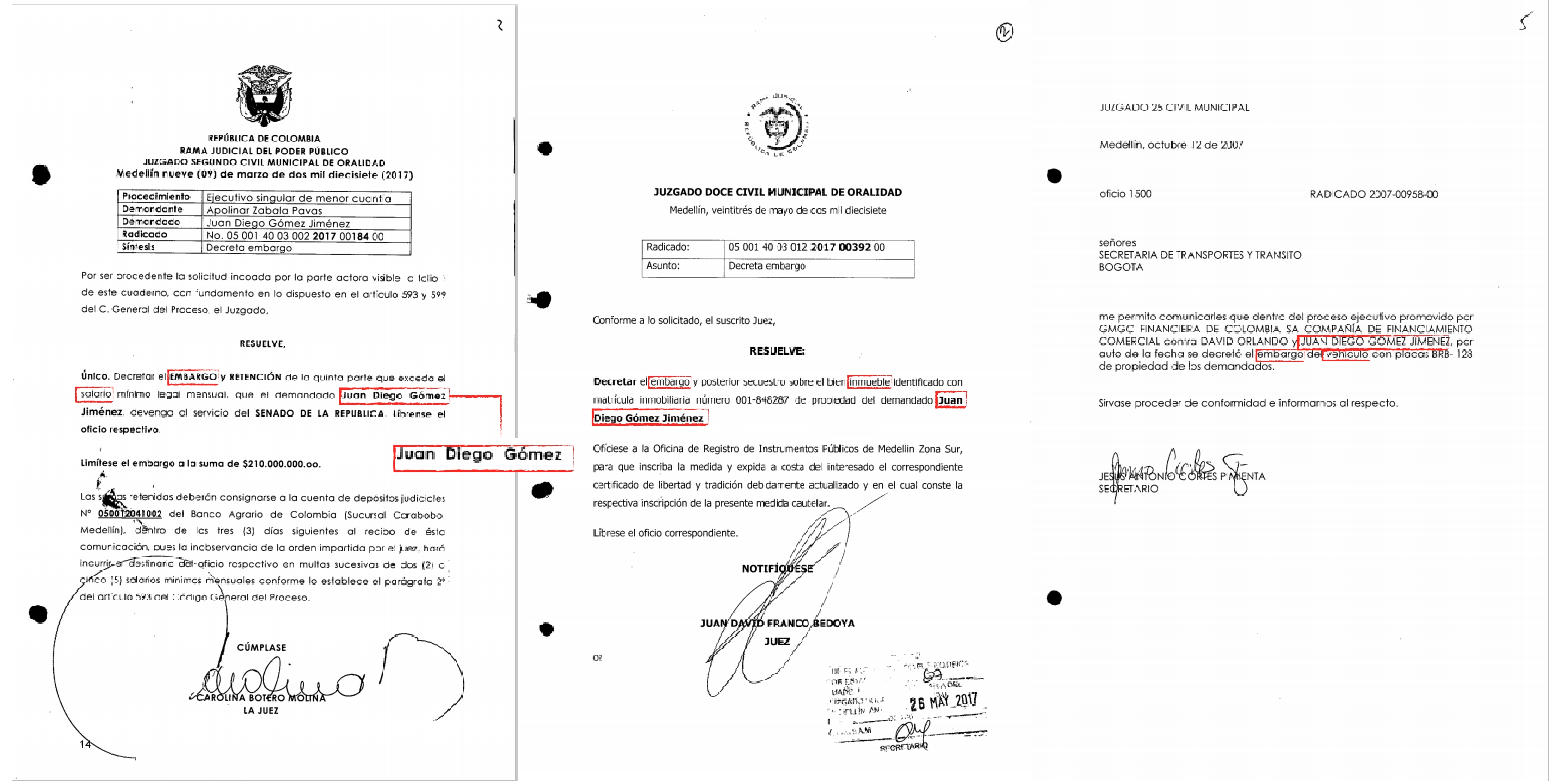 El segundo proceso de embargo fue el de su sueldo. El 28 de enero de 2014, tres meses antes de las elecciones del Congreso, Gómez Jiménez le firmó una letra por 50 millones de pesos a Apolinar Zabala Pavas, que se comprometió a pagar un mes después. Tres años y un mes más tarde, Zabala demandó al senador porque “no se ha dignado pagar el importe del título valor, como tampoco los intereses de mora causados hasta el momento, no obstante los continuos cobros”. En ese momento, ya la deuda estaba en casi 90 millones y eso era lo que estaba reclamando Zabala al senador en el Juzgado Segundo Civil de Medellín, que el 9 de marzo de 2017 embargó una quinta parte del sueldo del congresista antioqueño.