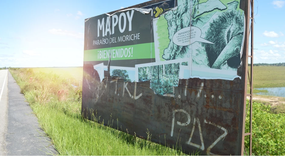 Al lado de ese letrero está la ruina de uno más grande. “Salió como chimbo”, me dice alguien, porque a los tres meses se dañó y solo quedó la estructura, sin embargo, se alcanza a leer: “Mapoy - Paraíso del Moriche” y la palabra “PAZ”, escrita como un rayón hecho con aerosol. Esa es la señal para llegar. 15 minutos más tarde y después de 5 km de recorrido, se llega a este espacio donde todo parece posible.