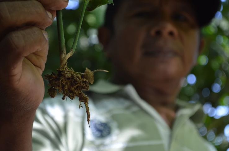 La cámara enfoca a la planta y no a Pompilio. "No importa -dice él- todo empieza por la raíz". Foto de Cristhian Andrés Aguirre.