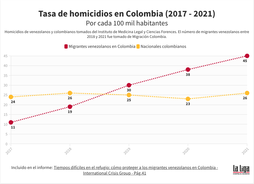 El número de venezolanos asesinados en Bogotá ha aumentado cada año. Pasó del registro de uno en 2016, a 72 en 2019, y a 109 en 2021, según cifras de la Alcaldía de Bogotá. A nivel nacional, la tasa de homicidios de venezolanos también aumentó y casi se duplicó en dos años. Un análisis de datos de Medicina Legal, el Departamento Administrativo Nacional de Estadística (DANE) y Migración Colombia muestra que la tasa de homicidios contra estos migrantes casi duplica la de colombianos asesinados.