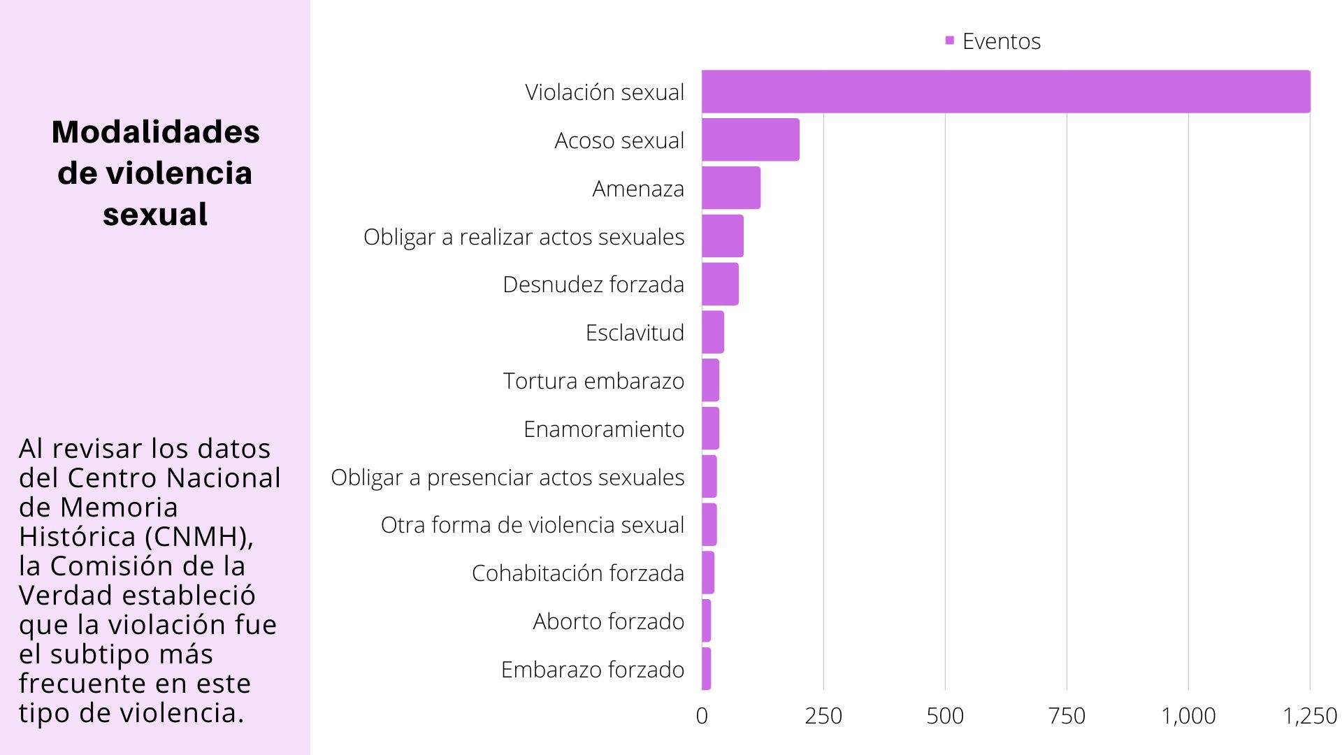 La Comisión encontró que el grupo paramilitar perpetró la violencia sexual como un mecanismo para generar pánico y recompensar a aquellos hombres que arriesgaron su vida en combate, por lo que los cuerpos de aquellas mujeres violadas cumplieron el papel simbólico de mostrar el poder que tenían los actores armados al establecerse en una zona y destruir su esfera social. Una de las características que diferenció al fenómeno paramilitar de los demás actores armados fue la exacerbada crueldad de actuar sin tener en consideración la edad y las condiciones de sus víctimas, siendo la explotación sexual, el acoso, la desnudez forzada, la violación, la obligación de presenciar actos sexuales, y la amenaza de violación, las modalidades de abuso sexual más comunes. En el marco del conflicto armado, 31.133 mujeres fueron víctimas de violencia sexual, en el que las niñas y jóvenes (entre los 12 y los 28 años) de las zonas rurales se vieron más afectadas, según la entidad encargada de aclarar qué pasó.