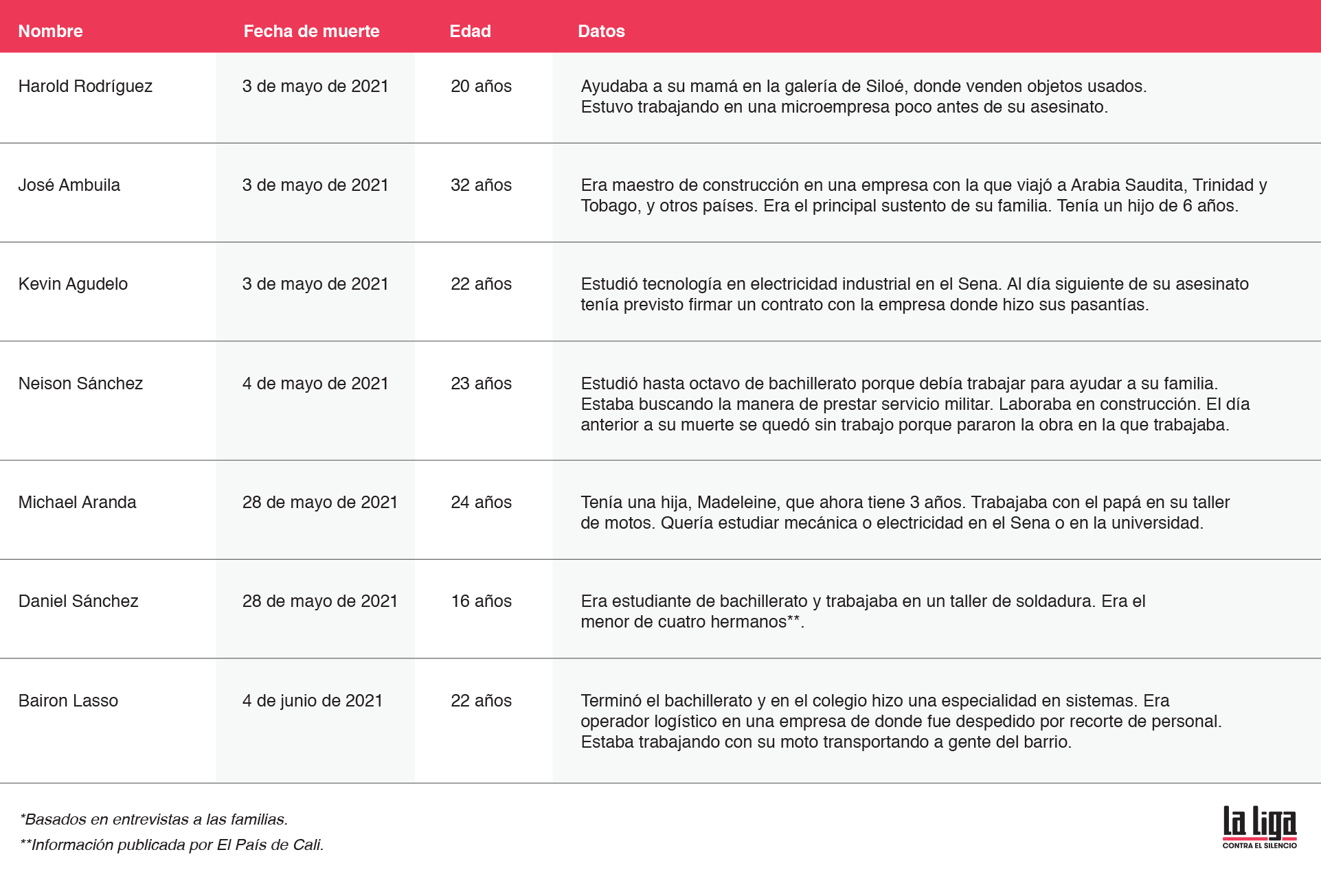 Algunos fallecidos de Siloé fueron más conocidos, como los jóvenes que aparecen en el mural. Pero hay otros menos visibles, como Neison Sánchez, de 23 años, hallado con heridas de bala y cuchillo en la glorieta de Siloé el 4 de mayo. También está el caso de Didier Andrés Quintero, de 17 años, quien participaba en las protestas. Su cuerpo apareció la mañana después del 28 de mayo, día del incendio en el local de Dollarcity, con quemaduras y heridas de bala en otra zona de Siloé. En ese mismo comercio encontraron el cuerpo calcinado de Daniel Sánchez (ver su caso abajo).