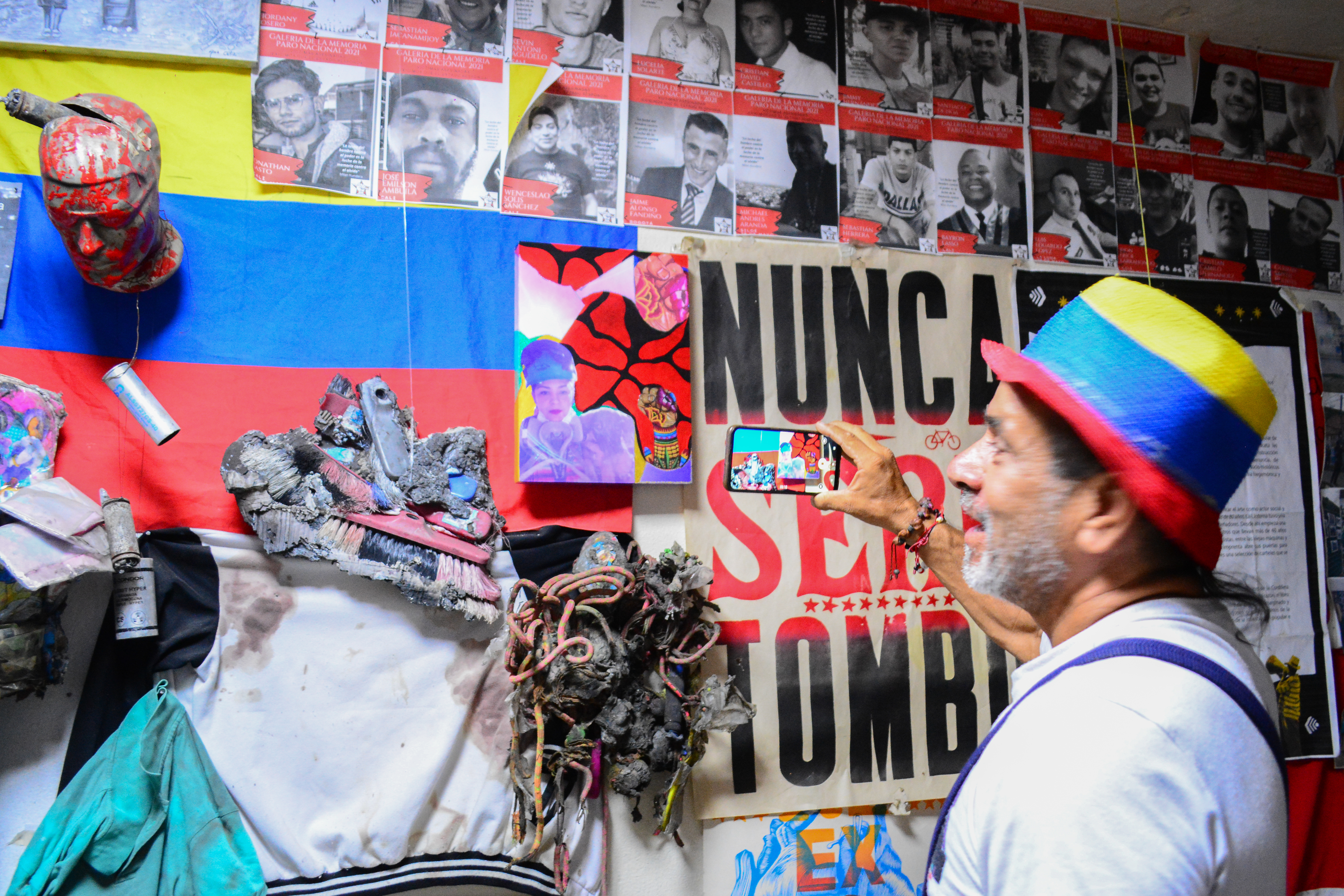 Cerca está el Museo Popular de Siloé. “Prohibido hacer silencio. Att. La Memoria de Siloé”, dice un aviso al entrar. En el segundo piso, la sección del paro reúne diversos objetos: bolsas de leche vacías, casquillos de balas, restos de bombas lacrimógenas, banderas, cascos, piedras, palos, escudos; todo aquello que la gente llevó al lugar. A pocas cuadras, junto al cementerio, un mural se extiende colorido con los rostros de jóvenes asesinados en medio de la represión policial, entre ellos cinco caídos en Siloé. No todos eran manifestantes; algunos solo pasaban por ahí: José Ambuila (32), Kevin Agudelo (22) y Harold Rodríguez (20), el 3 de mayo; Daniel Sánchez (16) y Michael Aranda (24), el 28 del mismo mes.