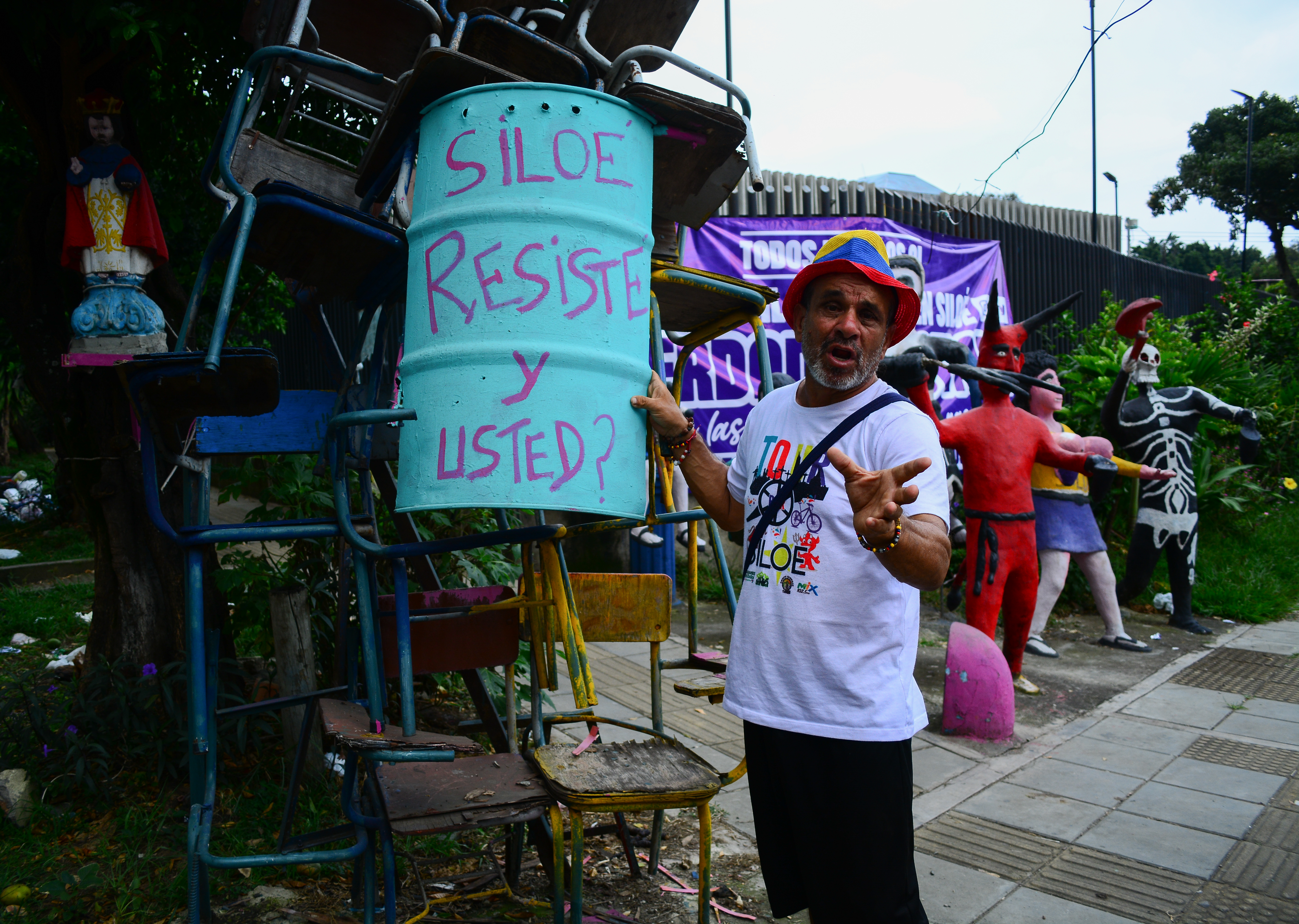 David Gómez, líder social de Siloé y curador del Museo Popular, junto a un sencillo monumento para recordar el paro nacional del año pasado. Foto: Edwin Rodríguez Pipicano