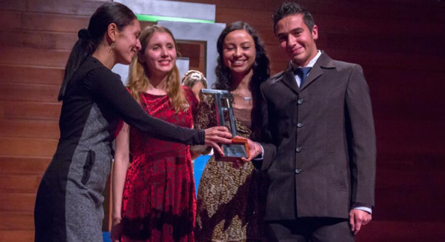 El Doctor Rafael Ordúz Medina, Director de Investigación, Creación e Innovación, entregó el reconocimiento a los estudiantes Carlos Alzate, María Camila Sánchez y Alejandra Aguilar, junto a la profesora Claudia Reyes Sarmiento.