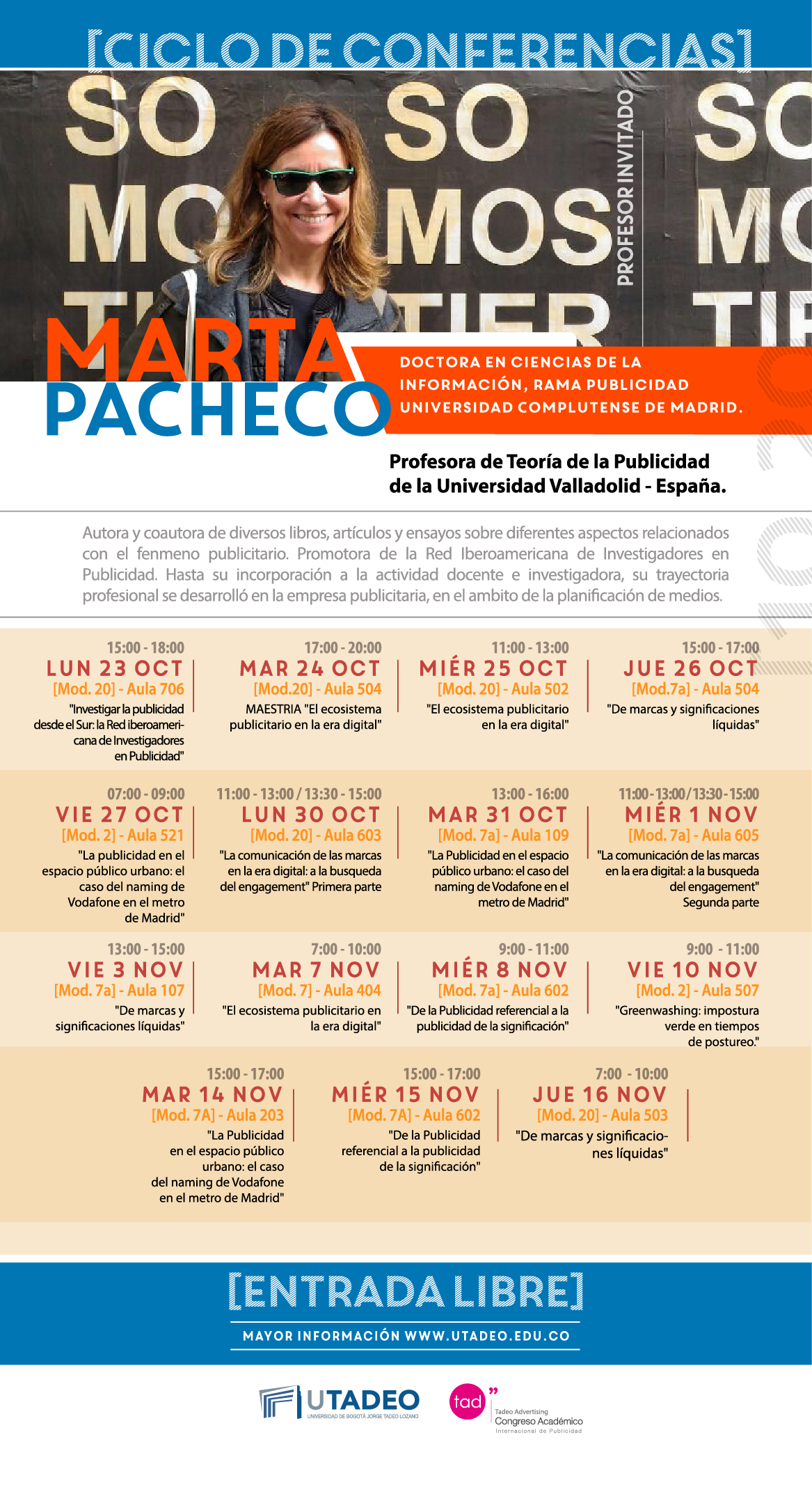 ¿Qué le espera a la publicidad ante el nuevo ecosistema mediático? ¿Cómo deben comunicarse las marcas en un mundo permeado por la globalización y lo digital? Como parte de la estrategia de internacionalización de la Facultad de Artes y Diseño de Utadeo, la Escuela y el programa de Publicidad presentan el ciclo de conferencias con la profesora de Teoría de la Publicidad de la Universidad de Valladolid (España), Marta Pacheco Rueda, que se lleva a cabo del 23 de octubre al 16 de noviembre.