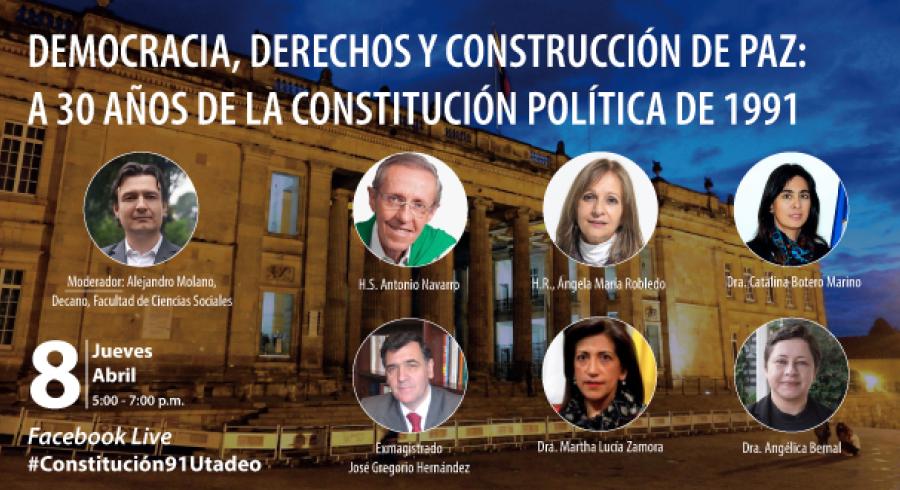 Con la participación de algunos de los principales constituyentes de 1991, académicos y constitucionalistas del país, entre ellos Antonio Navarro Wolff, Ángela María Robledo, José Gregorio Hernández, Catalina Botero, Martha Lucía Zamora y Angélica Bernal, bajo la moderación del decano de la Facultad de Ciencias Sociales de Utadeo, Mario Alejandro Molano, este 8 de abril, de 5:00 a 7:00 p.m., a través de nuestra página oficial en Facebook, se llevará a cabo el conversatorio virtual: “Democracia, derechos y construcción de paz: A 30 años de la Constitución Política de 1991”. La entrada será libre para todo público.