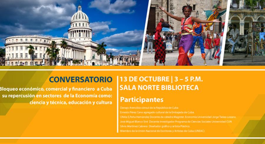 El próximo jueves 13 de octubre, a partir de las 3:00 p.m., en la Sala Norte de la Biblioteca de Utadeo, el programa de Economía llevará a cabo el “Conversatorio Bloqueo Económico, Comercial y Financiero a Cuba. Su repercusión en sectores de la Economía como: ciencia y técnica, educación y cultura”. La entrada es libre.