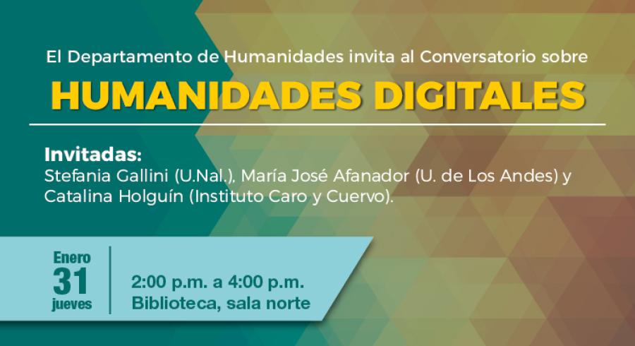 En el Departamento de Humanidades de Utadeo queremos conversar con las profesoras Stefanía Gallini (U. Nacional de Colombia), María José Afanador (U. de Los Andes) y Catalina Holguín (Instituto Caro y Cuervo) sobre cómo entienden las Humanidades digitales, su papel actual y las posibilidades que nos pueden ofrecer. Al mismo tiempo queremos conversar con ellas sobre cuáles son los proyectos que han liderado y cuáles han sido sus experiencias como pioneras de las Humanidades digitales en Colombia.
