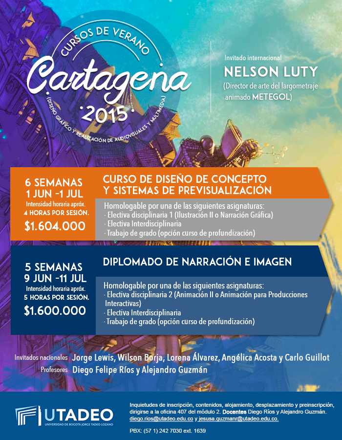 El área de animación de los programas de Diseño Gráfico y Realización de Audiovisuales y Multimedia invita a la comunidad académica interesada en realizar los cursos de verano en Cartagena 2015. En esta oportunidad ofrece dos propuestas: Curso de Diseño de Concepto y Sistemas de Previzualización y el otro un Diplomado de Narración e Imagen.