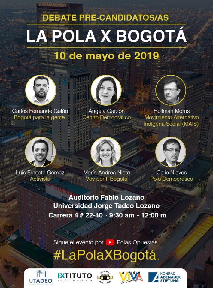 Con el objetivo de fomentar la participación política informada de los jóvenes bogotanos, la Fundación Konrad Adenauer, la Universidad Jorge Tadeo Lozano, el Extituto de Política Abierta, la Corporación Viva la Ciudadanía y el programa de opinión Polas Opuestas llevarán a cabo el primer debate de precandidatos a la Alcaldía de Bogotá.
