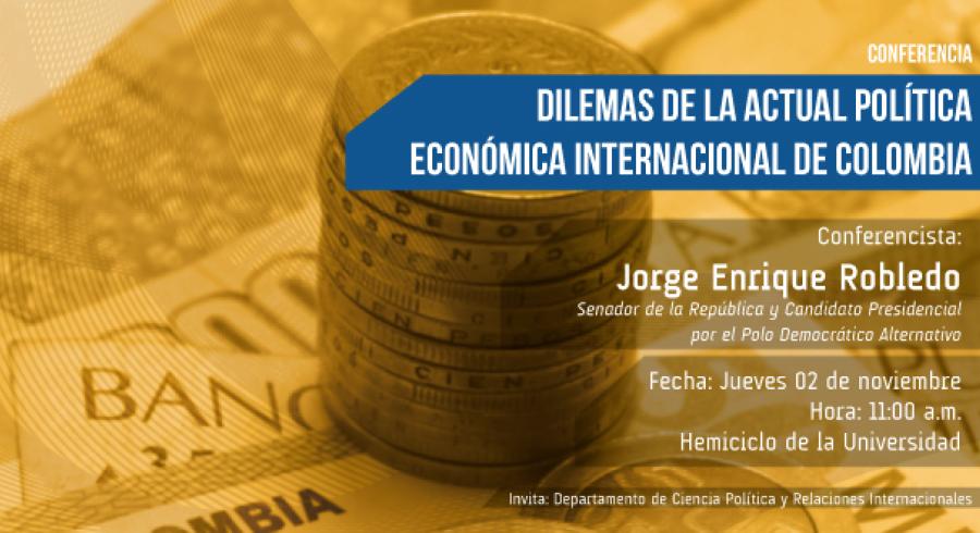 En el marco de las cátedras de Diplomacia contemporánea y economía y ciencias sociales, el Departamento de Ciencia Política y Relaciones Internacionales ha querido generar un espacio académico para debatir los dilemas de la política económica internacional de Colombia y los Tratados de Libre Comercio. En esta ocasión, el invitado será el Senador y candidato presidencial por el Polo Democrático, Jorge Enrique Robledo, quien en varios escenarios ha discutido y argumentado los efectos y consecuencias de la firma de los Tratados de Libre Comercio en la industria nacional y el desarrollo del país.