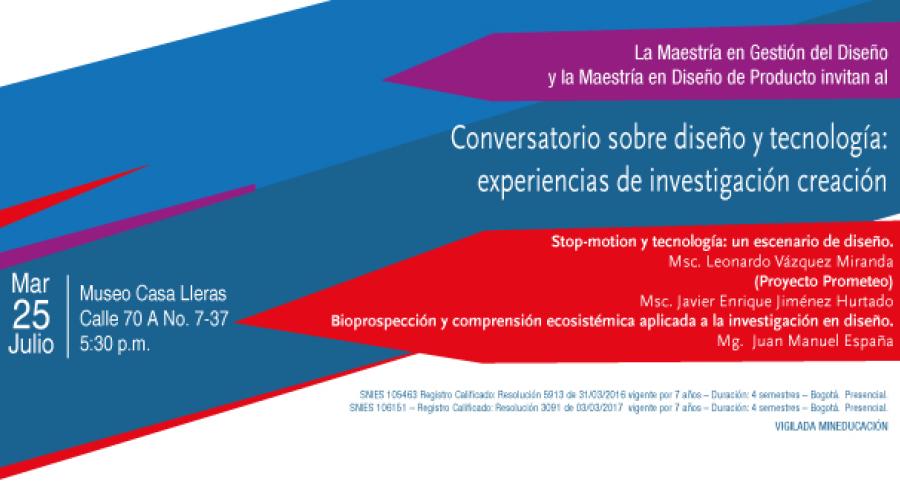 El Conversatorio “Diseño y tecnología: experiencias de investigación creación” es un espacio de reflexión sobre algunos procesos y resultados de proyectos que se adelantan en el grupo de Investigación Diseño; Pensamiento; Creación de la Escuela de Diseño de Producto y los Programas de Diseño Industrial. La intención del conversatorio es mostrar la fuerte relación que tienen estos proyectos con el diseño y la tecnología, y la manera como ambas se soportan en los procesos creativos con fines de innovación para el desarrollo de productos.