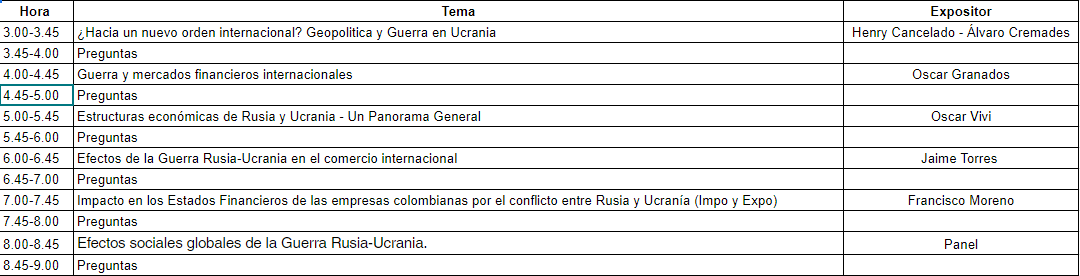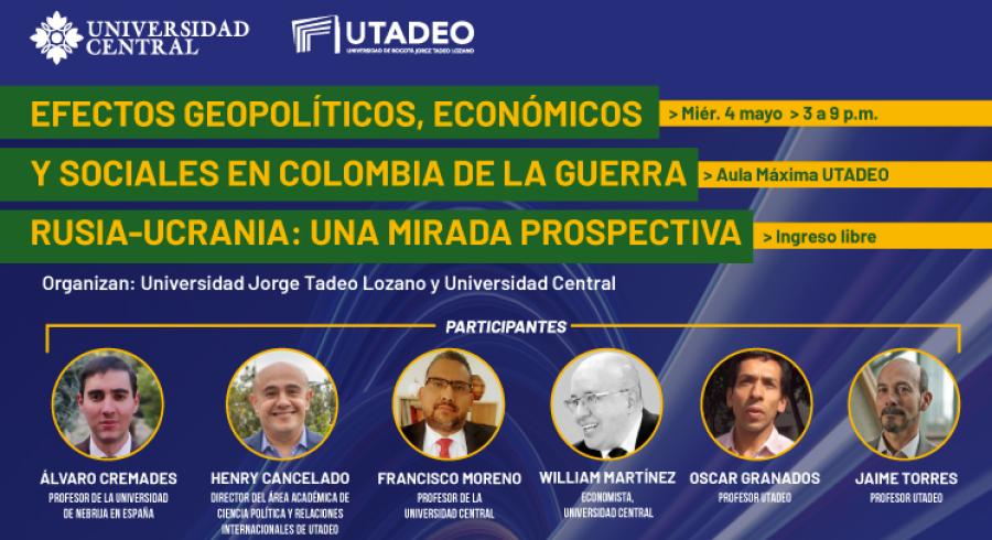 Considerando lo anterior, las Facultades de Ciencias Económicas y Empresariales de la Universidad Central y de la Universidad Jorge Tadeo Lozano han organizado el seminario “Efectos geopolíticos, económicos y sociales en Colombia de la guerra Rusia-Ucrania: una mirada prospectiva”. En el mismo participarán docentes de las dos instituciones y se abordarán temas como las perspectivas de un nuevo orden geo-político; las repercusiones de la guerra en los mercados financieros; los efectos en el comercio internacional y la seguridad agroalimentaria; y el impacto en los Estados Financieros de las empresas colombianas por el conflicto entre Rusia y Ucrania (importaciones y exportaciones). El evento se cerrará con un coloquio con los profesores participantes quienes debatirán en torno a los efectos sociales globales de la Guerra Rusia-Ucrania.