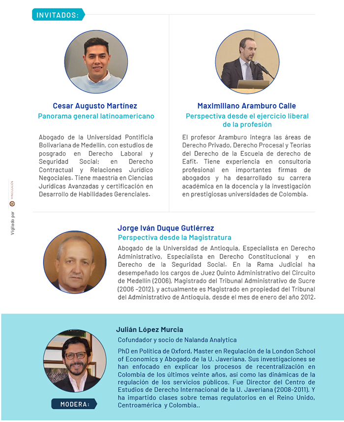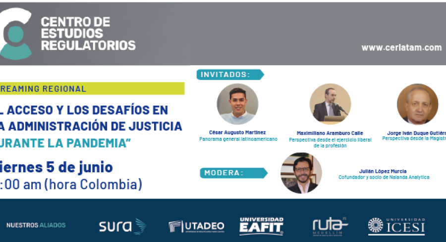 Como parte del primer evento de la agenda académica del Centro de Estudios Regulatorios, el próximo 5 de junio, a las 11:00 a.m. (Hora Colombia), se llevará a cabo el streaming regional “El acceso y los desafíos en la administración de justicia durante la pandemia”, que tendrá como invitados a César Augusto Martínez, quien hablará sobre el panorama del sector a nivel latinoamericano. Por su parte, Maximiliano Aramburo Calle hablará sobre la perspectiva del ejercicio liberal de las profesiones en tiempos de pandemia, y Jorge Iván Duque Gutiérrez abordará la perspectiva que se tiene desde la Magistratura. Julián López Murcia, cofundador y socio de Nalanda Analytica, moderará el encuentro.