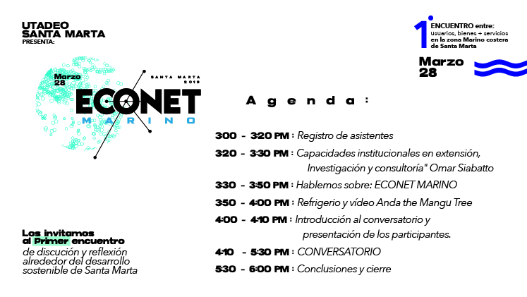 Econet Marino es organizado por la Oficina de Consultoría de Utadeo, de la Dirección de Investigación, Creación y Extensión (DICE), y tendrá como objetivo visualizar el trabajo de la academia en pro del desarrollo sostenible de Santa Marta, buscando integrar las opiniones de los diferentes actores de la zona marina costera de la ciudad, entre los que se destacan el Instituto de Investigaciones Marinas y Costeras (Invemar), Cotelco Magdalena, la Autoridad Nacional Pesquera (Aunap), la Procuraduría Ambiental, Drummond LTD y la Fundación Museo del Mar.