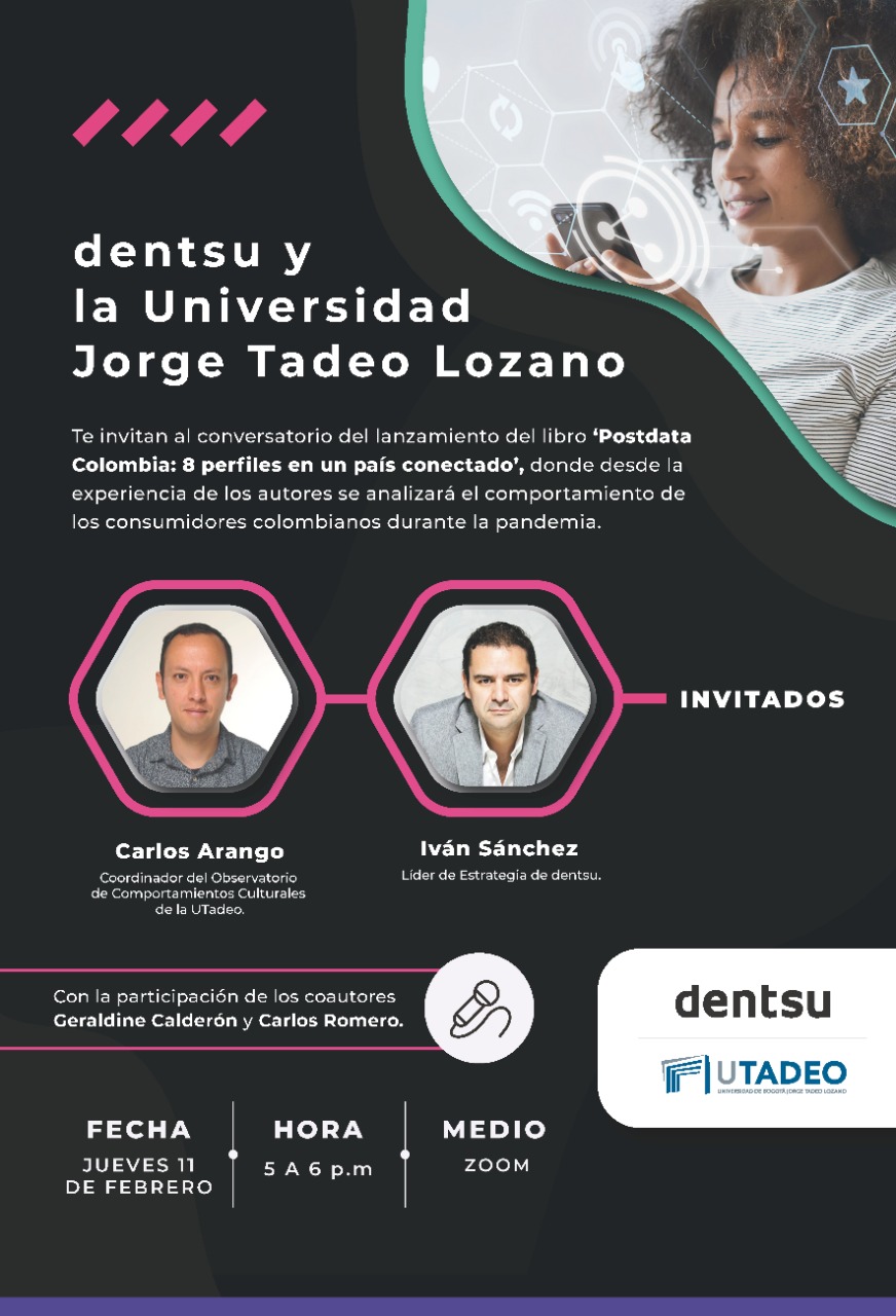 El conversatorio contará con la participación de los autores de la publicación: Carlos Arango, coordinador del Observatorio de Comportamientos Culturales de Utadeo; Iván Sánchez, líder de estrategia de Dentsu; Geraldine Calderón, data analyst en PHD, y Carlos Romero, director en Annalect, unidad de Modeling y Analytics de Omnicom Media Group.