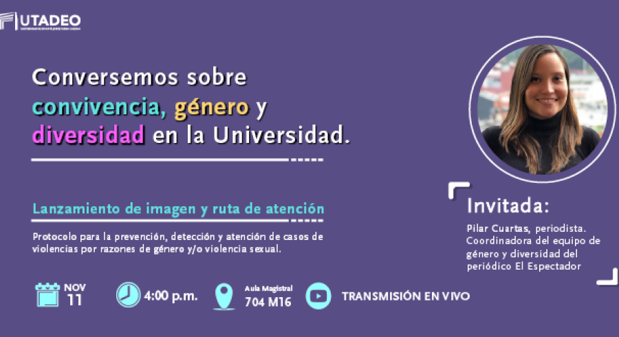 El viernes 11 de noviembre a las 4:00 p.m. en el Aula Magistral 704 del modulo 16 y en YouTube, toda la comunidad tadeísta está invitada al lanzamiento de la imagen y ruta de atención del protocolo resolución N°020 “Por la cual se adopta el Protocolo para la Prevención, Detección y Atención de Violencias y cualquier tipo de discriminación por Razones de Género y/o Violencia Sexual para la Fundación Universidad de Bogotá Jorge Tadeo Lozano".