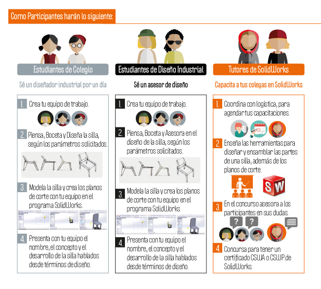 Se hará un breve repaso por las tendencias y estilos de mobiliario, así como por algunos criterios conceptuales y ergonómicos en el diseño de sillas, que les permitirán a nuestros participantes hacer brillantes reinterpretaciones del Diseño Industrial, con el apoyo de las herramientas y conocimientos de SolidWorks®.
