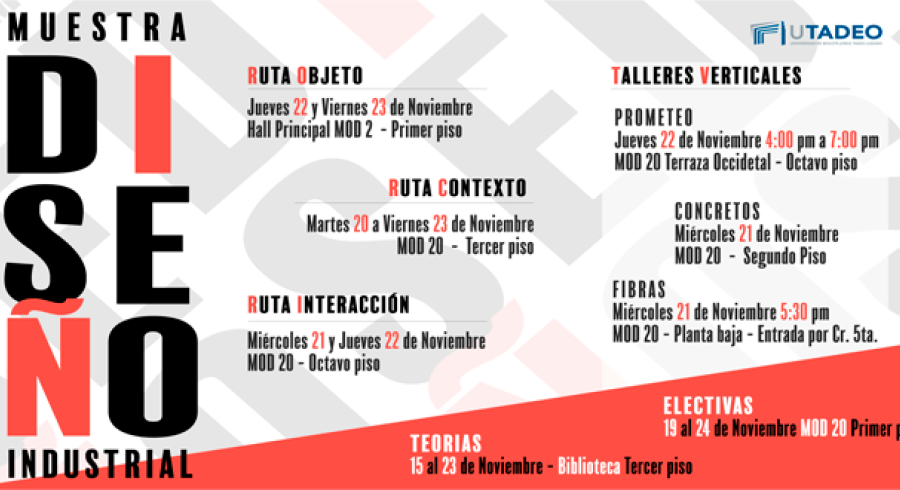 FibrasMiércoles 21 de noviembre 5:30 p. m. Módulo 20 - Planta Baja (entrada por la carrera 5ta) | Ruta InteracciónMiércoles 21 y jueves 22 de noviembre Módulo 20 - Octavo piso |