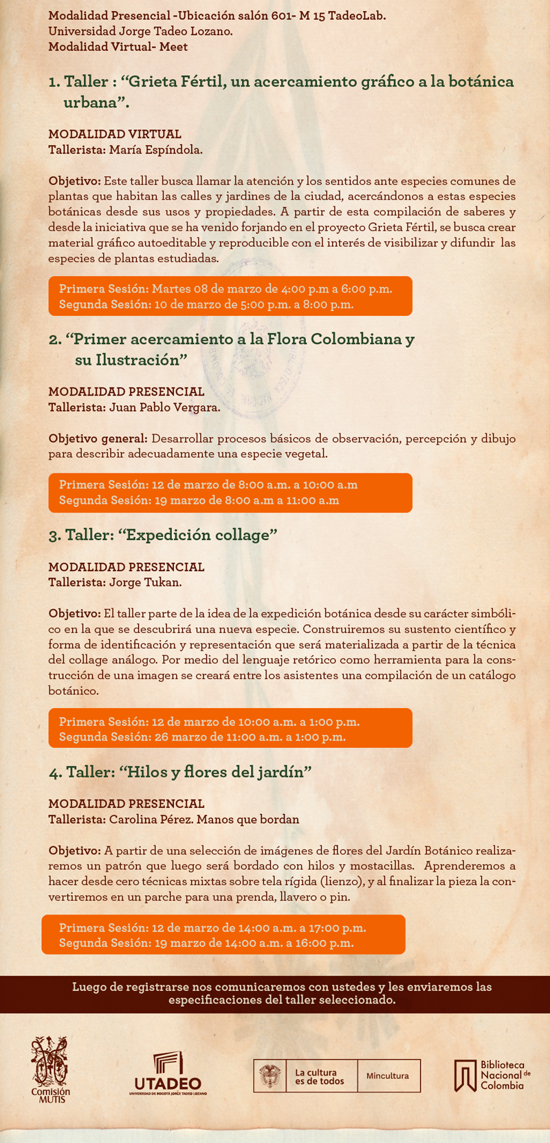 La Jefatura de Creación de la Universidad de Bogotá Jorge Tadeo Lozano invita a estudiantes, profesionales y público en general interesados en procesos de creación relacionados con la botánica, a inscribirse de forma gratuita en los talleres teórico-prácticos que se realizarán en el mes de marzo de 2022 en el marco de las actividades desarrolladas por la Comisión Mutis y la exposición "Libros y dibujos de la Casa de la Botánica: un patrimonio compartido" curada por el Real Jardín Botánico de Madrid, expuesta actualmente en la Biblioteca Nacional de Colombia (Bogotá).