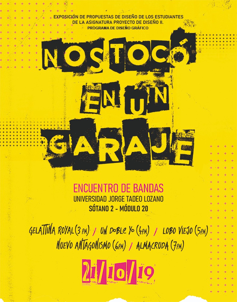 Con propuestas frescas en torno a las estrategias gráfico-promocionales que se generan en contextos y sistemas complejos de diseño enfocados a grupos musicales y sus escenarios de interacción y difusión, este 21 de octubre, en el sótano 2 del Edificio de Artes y Diseño (Módulo 20), los estudiantes de la asignatura Proyecto de Diseño II presentarán sus propuestas como parte de “Nos tocó en un garaje”, evento que, además, servirá como excusa para el encuentro de las bandas “Gelatina Royal”, “Un doble yo”, “Lobo viejo”, “Nuevo antagonismo” y “Almacruda”.
