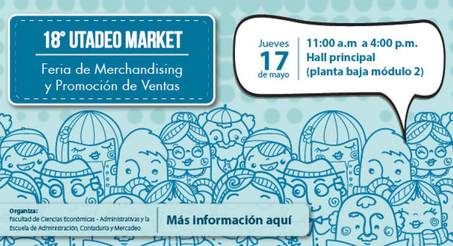 El jueves 17 de mayo, en el Hall principal (planta baja módulo 2) de Utadeo, se llevará a cabo la 18 versión de Utadeo Market “Feria de Merchandising y Promoción de Ventas”, a partir de las 11:00 a.m. y hasta las 4:00 p.m. organizada por la Escuela de Administración, Contaduría y Mercadeo de la universidad y liderada por Mónica Peñalosa Otero, Adriana Sotelo Ramírez y Omar Durán Espitia, profesores de la asignatura Merchandising y Promoción de Ventas.