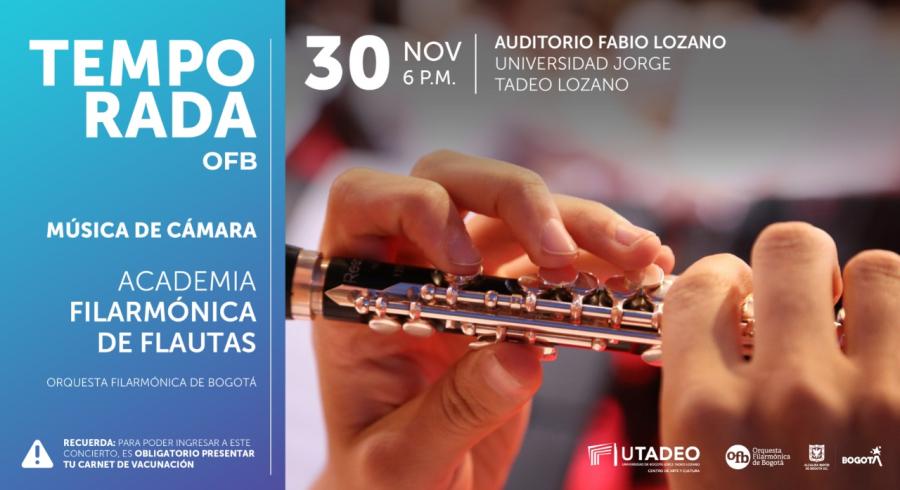 En este contexto, el próximo martes 30 de noviembre desde la 6:00 p.m. la Academia Filarmónica de Flautas dará un recital en el auditorio Fabio Lozano de Utadeo, al que podrás asistir gratuitamente, del cual harán parte los maestros Elizabeth Osorio y Ricardo Giraldo como talleristas invitados.