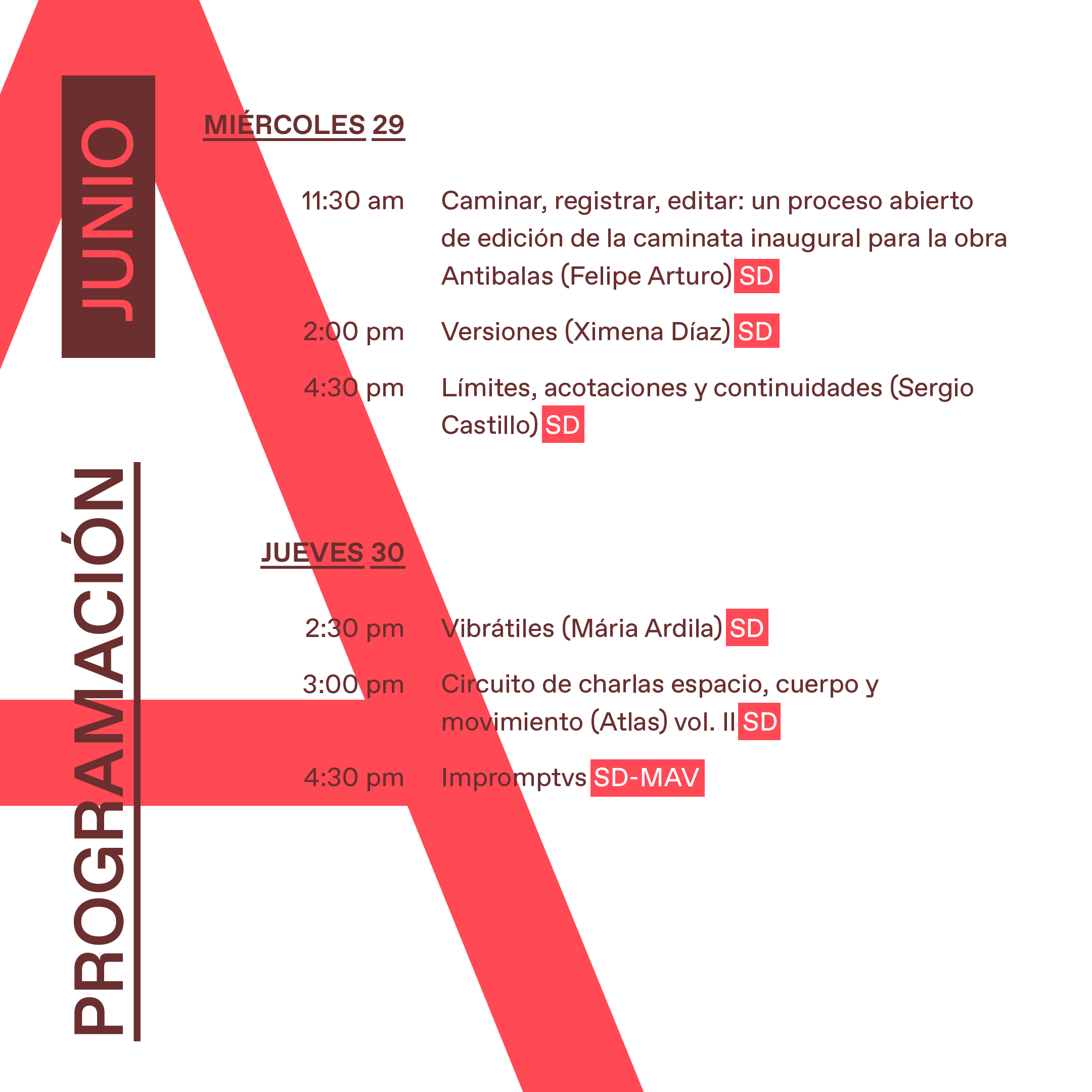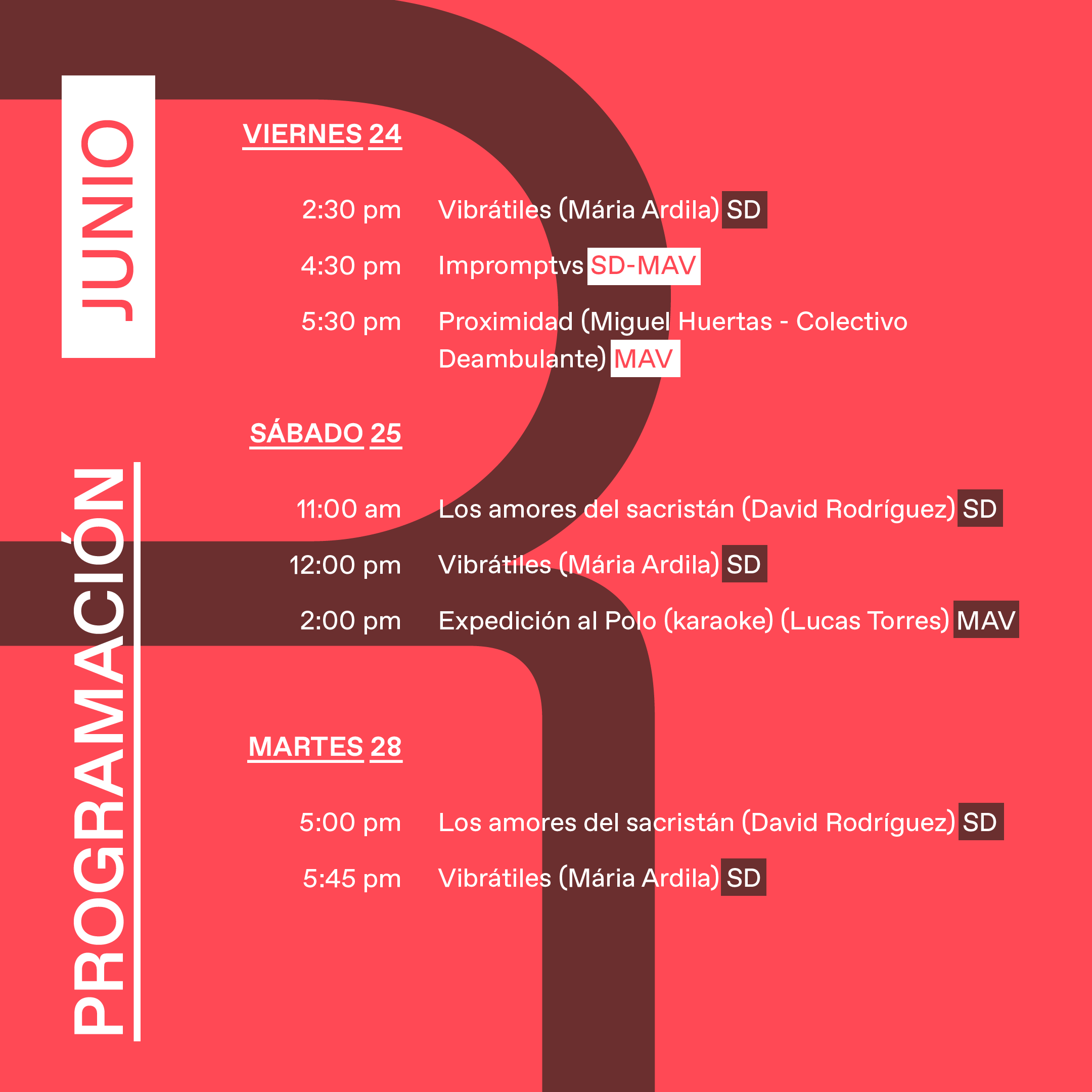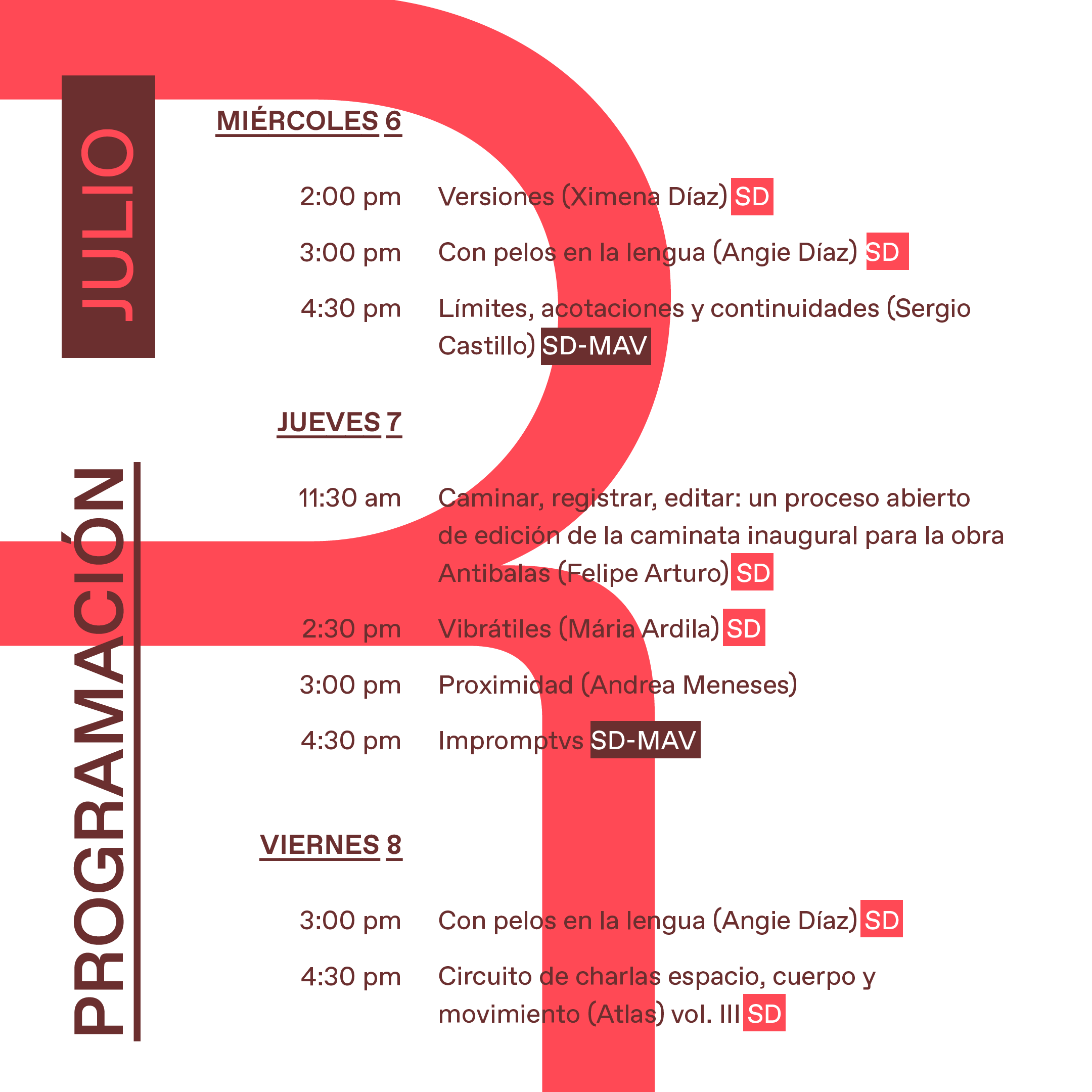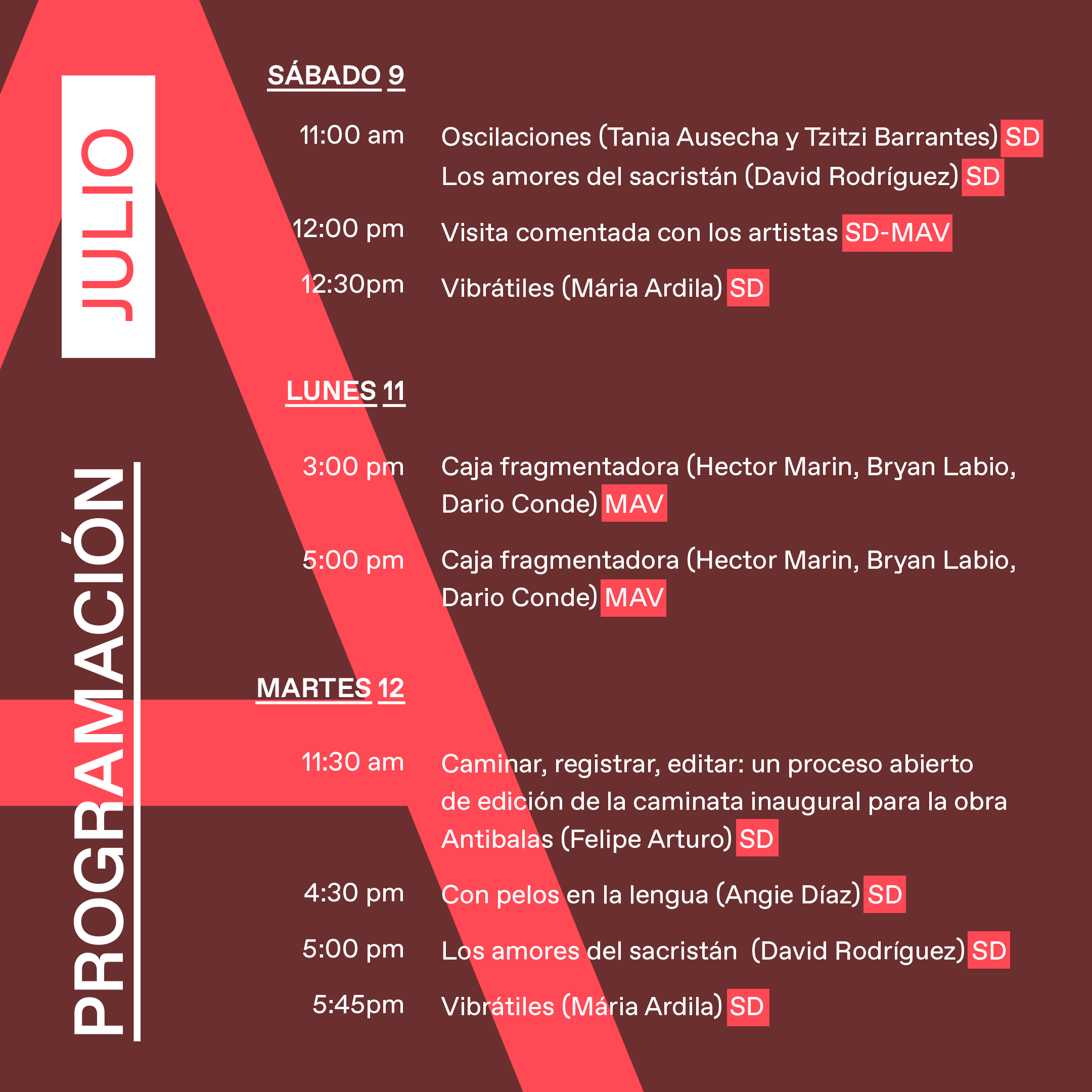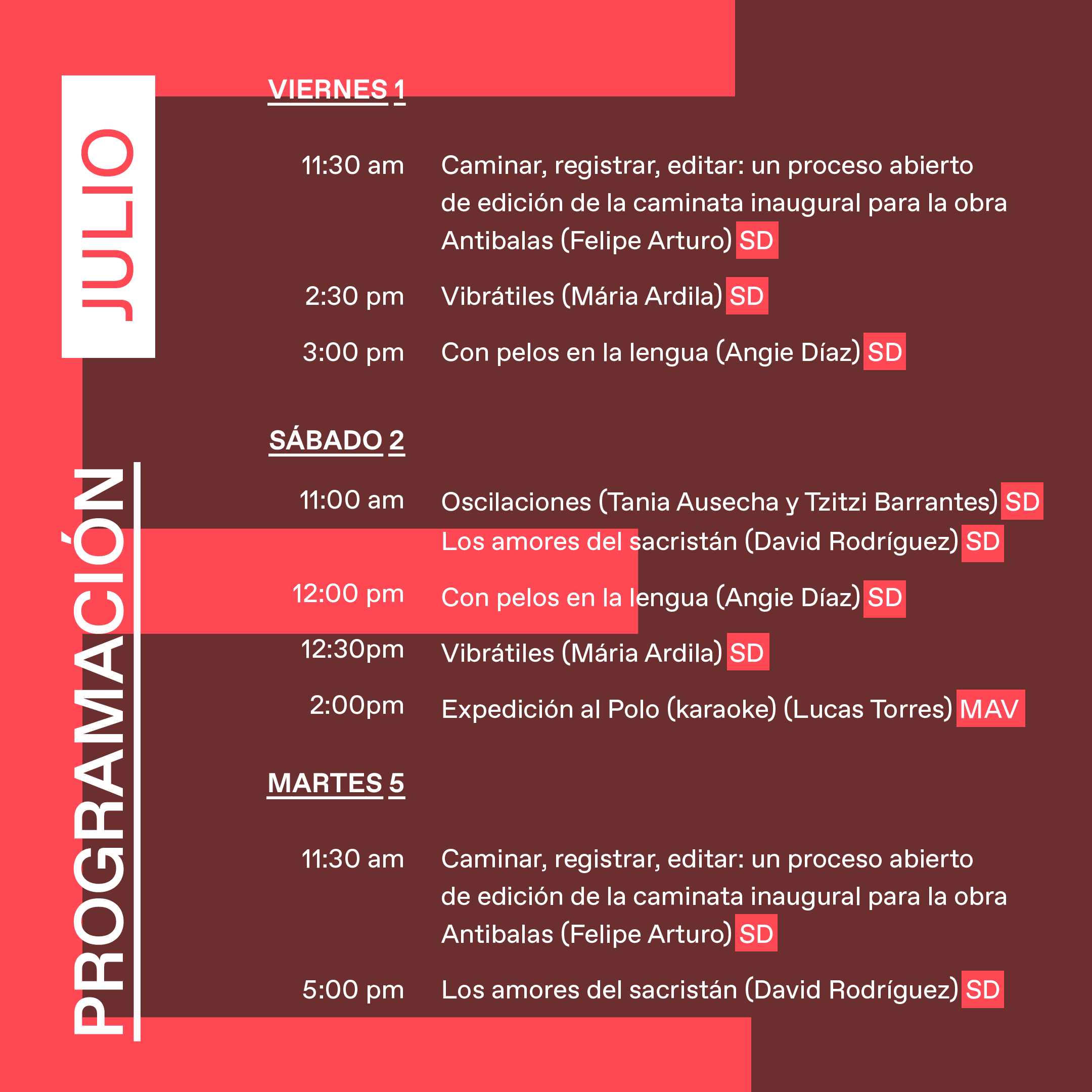 Sin embargo, la exposición es todo menos estática y su configuración se va transformando con el paso de los días. La exposición es también una suerte de partitura para varios instrumentos simultáneos, en tanto que cada obra tiene momentos propios de activación y su propio programa. Adicionalmente, se ofrecen una serie de mediaciones performáticas y eventos donde se desarrollan recorridos físicos y virtuales, presencias ruidosas y mudas.