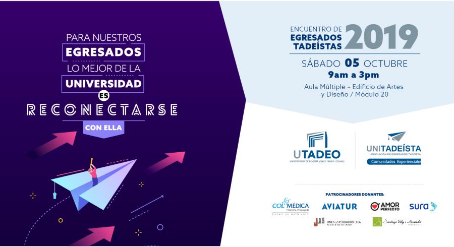 Octubre 05 / 2019La Universidad de Bogotá Jorge Tadeo Lozano y la Asociación de Egresados Tadeístas -UNITADEÍSTAS se complacen en invitarlo a participar en el Encuentro de Egresados Tadeístas 2019.