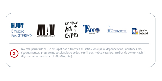 No está permitido el uso de logotipos diferentes al institucional para: dependencias, facultades y/o departamentos, programas, seccionales o sedes, semilleros y observatorios, medios de comunicación (Óyeme radio, Tadeo TV, HJUT, MAV, etc.).