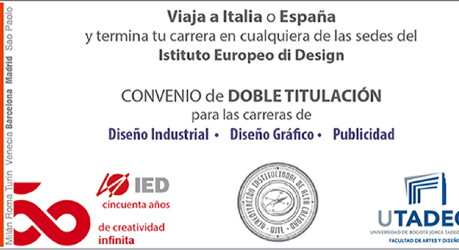 Si usted es estudiante de los programas de Diseño Gráfico, Diseño industrial y Publicidad de Utadeo, podrá ser beneficiario del convenio de doble titulación que tiene la Institución con el IED (Instituto Europeo de Diseño), el cual posibilita que estudiantes de estos pregrados puedan terminar sus estudios en cualquiera de las sedes de este prestigioso instituto.