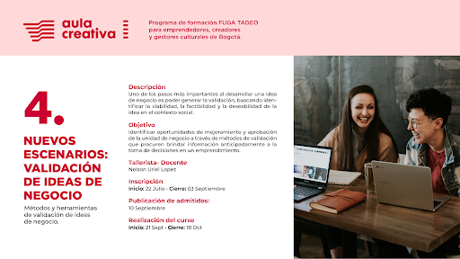 Este programa, liderado por la FUGA y Utadeo, busca formar gratuitamente a 367 personas vinculadas a proyectos o negocios asociados con la creatividad y la cultura, con el fin de ampliar las oportunidades de inclusión social y productiva. En esta ocasión podrás aspirar a participar en el curso 3 denominado “Impacta con tu mensaje: Narrativa y comunicación Digital” y el curso 4, llamado “Nuevos escenarios: Validación de ideas de negocio”, inscribiéndote hasta el 3 de septiembre, y de los que podràs conocer más a continuación.