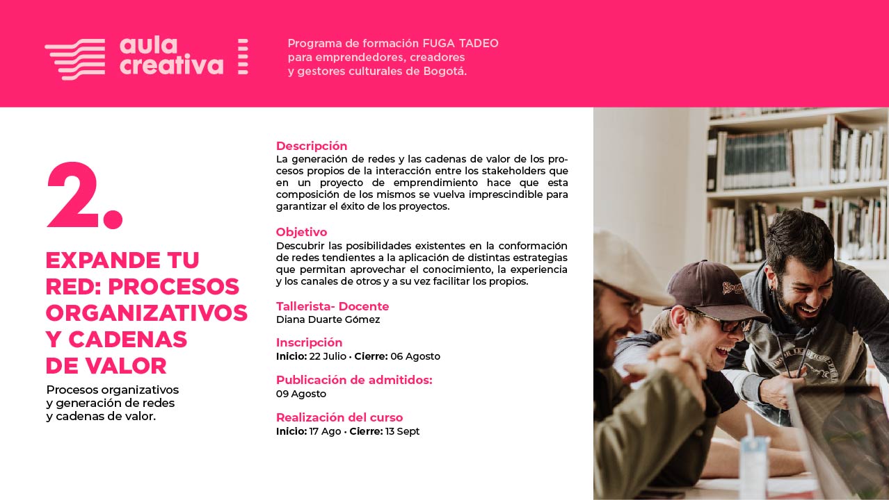 Este, precisamente, será uno de los principales retos que asumirá “Aula Creativa”, el programa de formación que beneficiará a cerca de 400 emprendedores culturales de la ciudad, en una alianza estratégica entre la FUGA (Fundación Gilberto Alzate Avendaño) y Utadeo, a través de los cursos 1 y 2: “Miradas al ecosistema cultural y creativo”, y “Expande tu red: procesos organizativos y cadenas de valor”.
