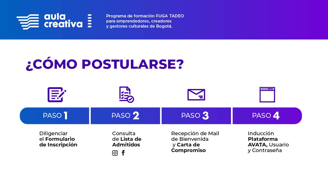 Recuerda que hasta el próximo 6 de agosto puedes postularte a ambos cursos. Para ello, diligencia el formulario de preinscripción que aparece al final de esta nota; posteriormente, consulta la lista de admitidos que será publicada en las redes sociales y páginas web de Utadeo y FUGA. En tercer lugar, recibirás un correo electrónico de bienvenida, junto con una carta de compromiso que deberás diligenciar. Por último, antes de iniciar el curso, tendrás una inducción en la Plataforma AVATA (Ambiente Virtual Tadeísta), sobre las cual se trabajará en los cursos, al igual que recibirás tu usuario y contraseña para acceder.