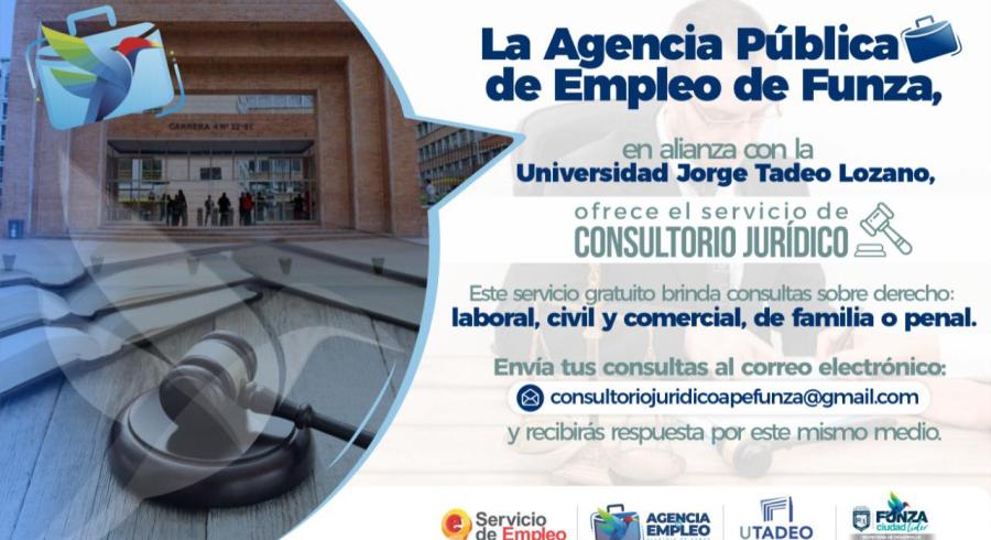 La Agencia Pública de Empleo de la Alcadía de Funza - Cundinamarca, en alianza con el Consultorio Jurídico y Centro de Conciliación de la Universidad Jorge Tadeo de Bogotá, ofece asesoría virtual, en las áreas de laboral y seguridad social, civil y familia, comercial y penal, respuestas mediante el correo electrónico