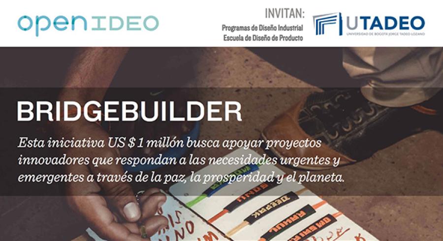 El Programa de Diseño Industrial invita a los estudiantes de la Universidad Jorge Tadeo Lozano a participar en el PROYECTO BRIDGEBUILDER -apoyado por la organización OpenIDEO y la Fundación GHR- cuya finalidad es el desarrollo de ideas innovadoras que respondan a las necesidades urgentes y emergentes en las intersecciones de Paz, Prosperidad y Planeta.