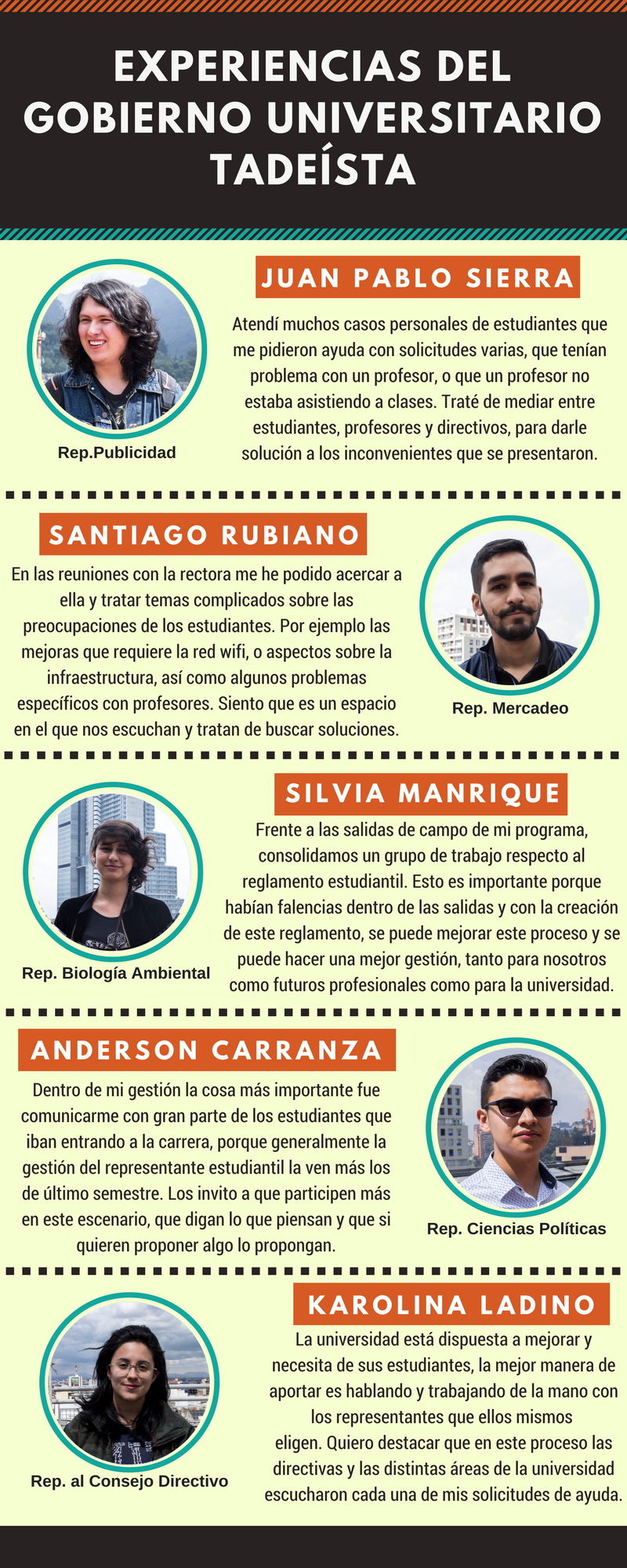 Nuestro Gobierno Universitario está conformado por los representantes de los estudiantes a los comités curriculares, elegidos para un periodo de dos años e integrantes, a la vez, del Consejo Estudiantil Tadeísta; por un representante de todos los estudiantes al Consejo Directivo, que es la máxima autoridad de la Universidad y es elegido por un año.