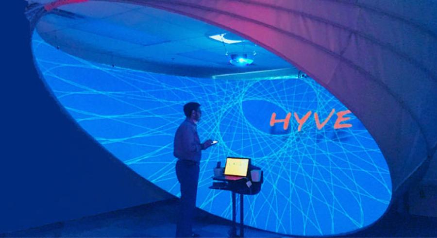El Hyve-3D trabaja la realidad virtual y desafía los conceptos de la perspectiva cónica tradicional (método de representación gráfica con el que se pretende simular profundidad), logrando que el sistema virtual dibuje esa profundidad en tercera dimensión mediante proyectores, sensores, tabletas y pantallas envolventes.