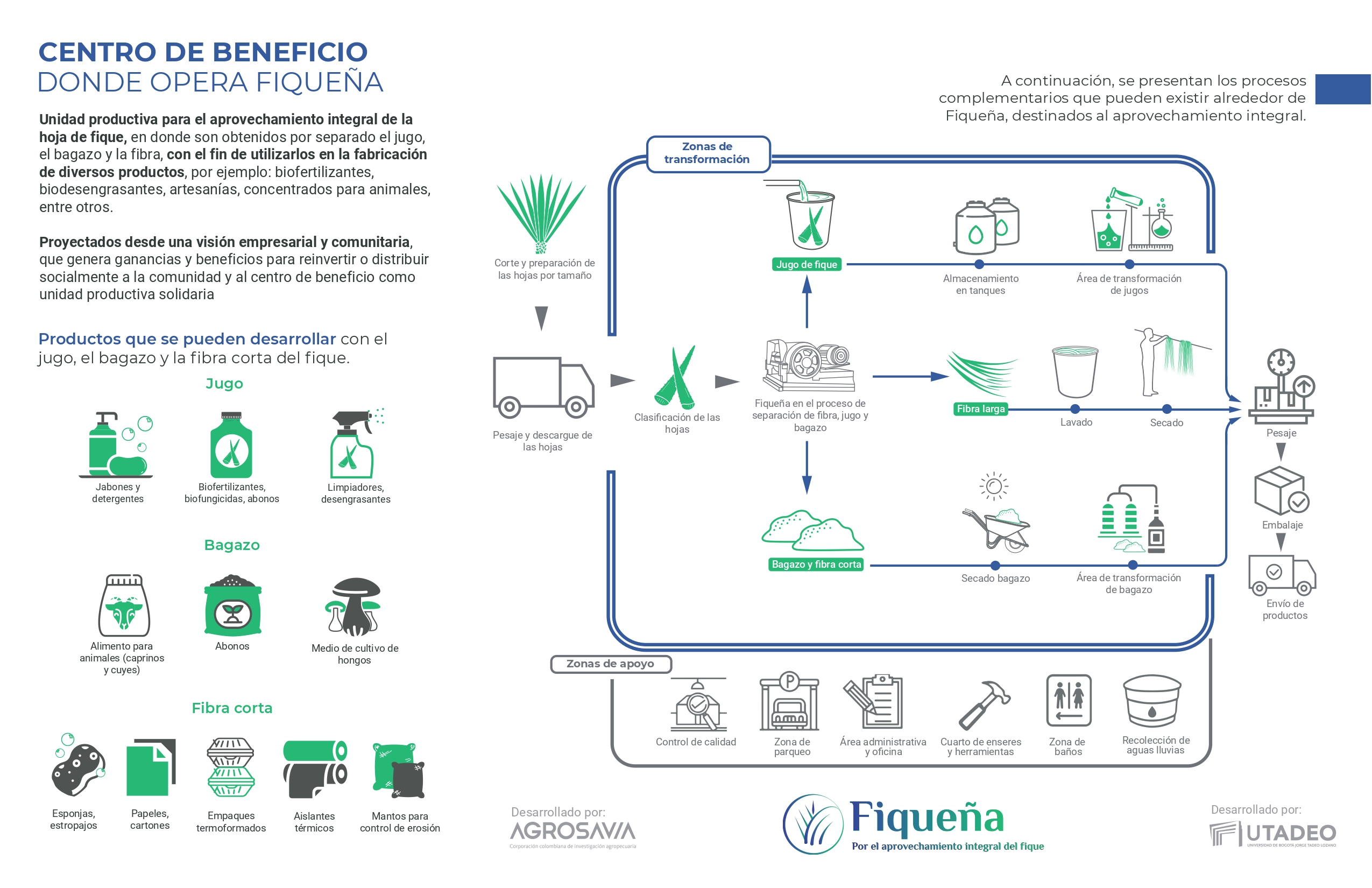 De esta manera, el cultivador corta y prepara las hojas de fique para llevarlas al centro de beneficio, donde son descargadas y pesadas. Posteriormente se clasifican las hojas para su proceso de transformación en la máquina, de donde se obtiene la fibra larga, la cual es llevada a los procesos de lavado y secado; por su parte el jugo es almacenado en tanques y luego pasado al área de transformaciones, mientras que el bagazo y la fibra corta pasan por secado y por un área de transformación. Al final, los tres productos se pesan, embalan y se transportan al destino final