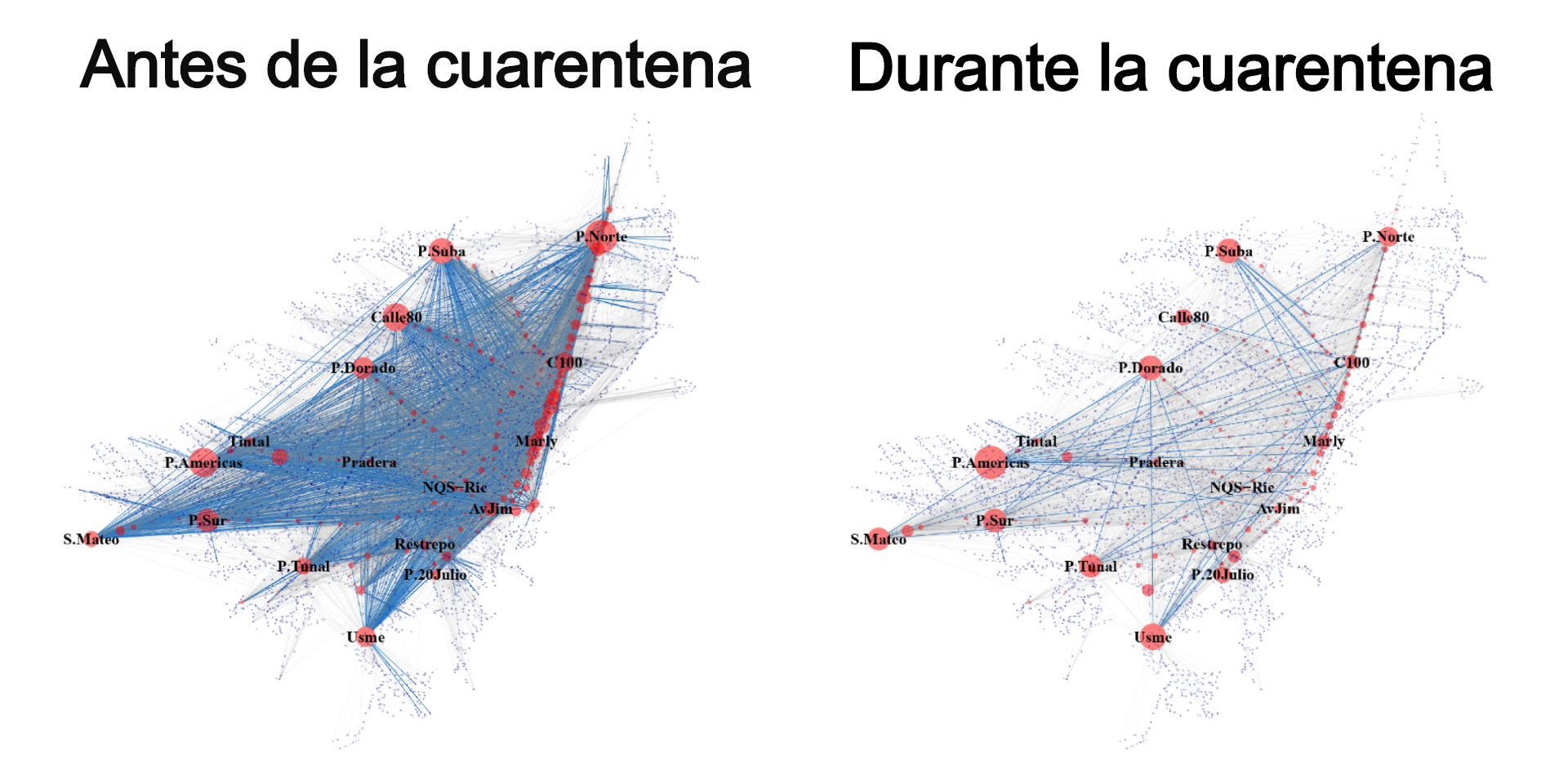Red de estaciones del sistema de transporte, antes y durante la cuarentena estricta. Los puntos rojos son estaciones de TM y los azules (más pequeños) son estaciones del SITP. El tamaño de los nodos representa el volumen de pasajeros, las líneas representan movimiento entre estaciones. Imagen: Cortesía