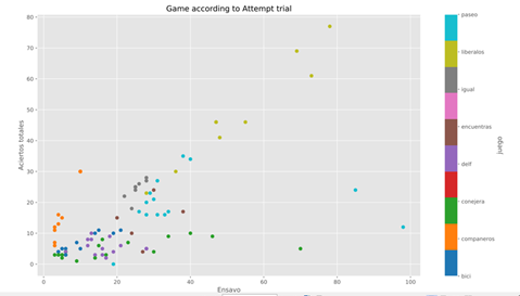 Gráfico de análisis de los datos en las pruebas. Aquí se muestra la cantidad de ensayos realizados en un juego versus los aciertos totales