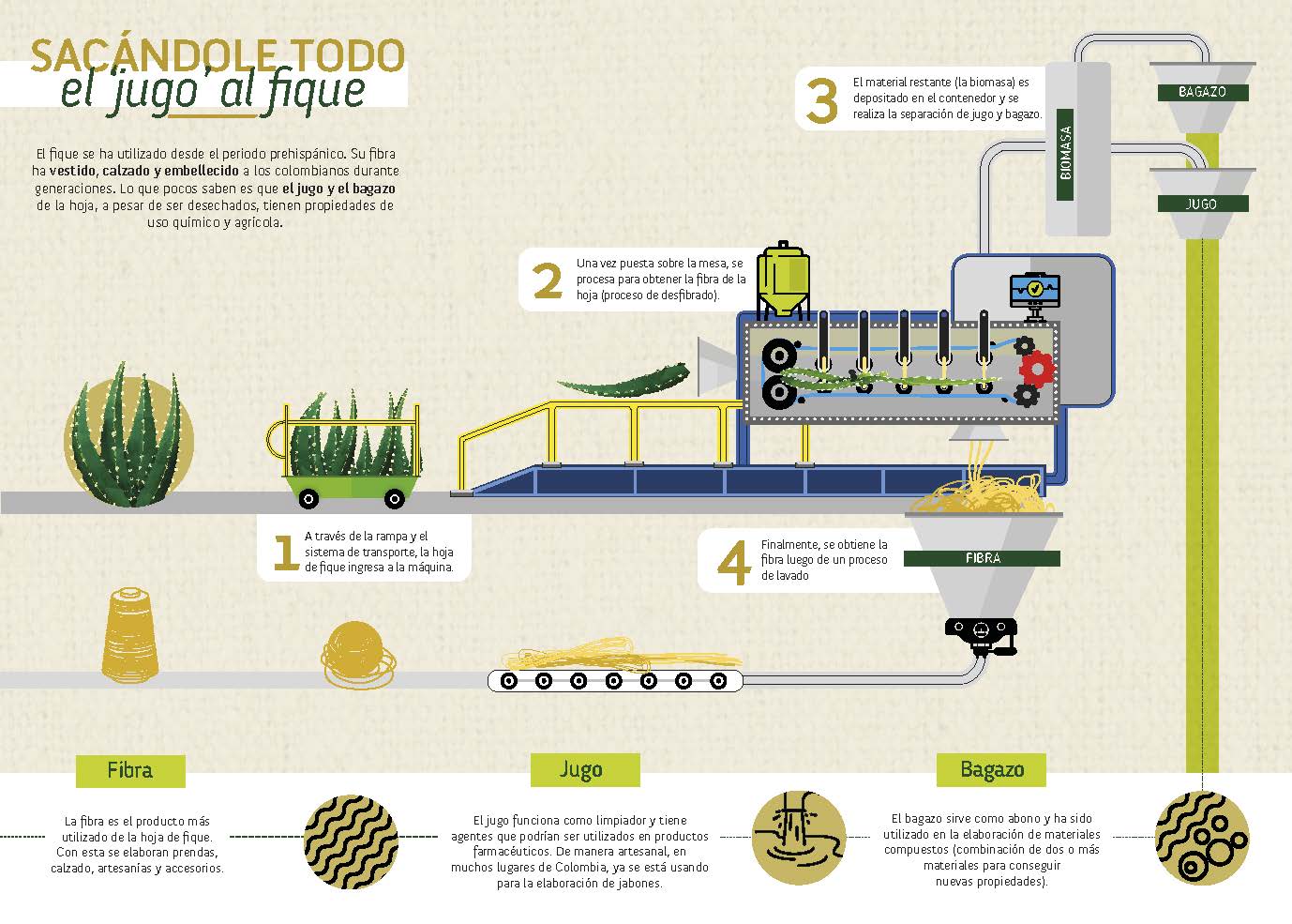 Una de las metas que se tienen con la máquina es fortalecer las capacidades productivas de los fiqueros, de tal manera que estos encuentren fuentes de ingreso asociadas a los componentes de la hoja. Investigaciones desarrolladas por Agrosavia, así como desde el Centro de Bio-Sistemas y el programa de Ingeniería Química de Utadeo han determinado que con el jugo del fique pueden elaborarse jabones y productos de aseo, así como pesticidas y biocontroladores de plagas. Algunas experiencias en el departamento de Nariño también concluyen que este subproducto puede utilizarse para abonos líquidos. En el caso del bagazo, se sabe que pueden fabricarse biomateriales y compostaje. Por su parte, en Brasil, con el bagazo del sisal, una planta que es familiar del fique, se desarrollan alimentos para rumiantes.