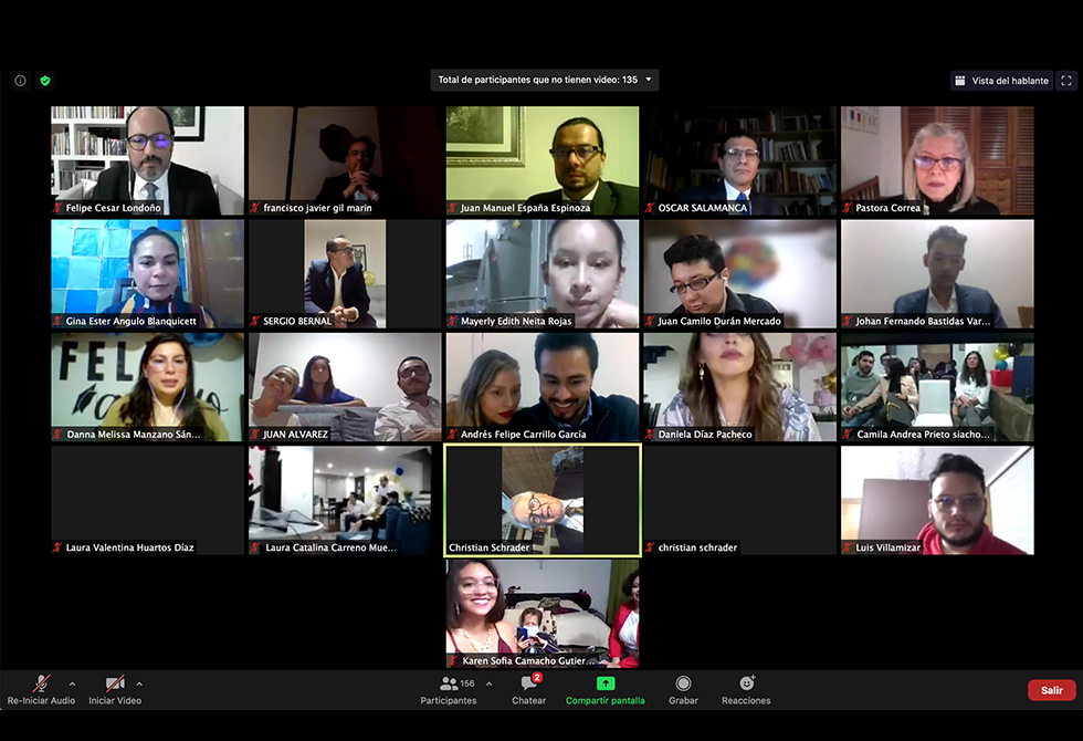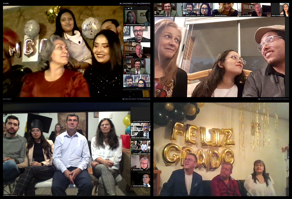 Luego de finalizar las ceremonias de grado, cada uno de los graduandos tuvo la oportunidad de reunirse con los compañeros y profesores que marcaron su camino en la Universidad; esta fue la oportunidad perfecta para reencontrarse, charlar y hasta ‘adelantar cuaderno’. Las salas de reunión en Zoom rápidamente se convirtieron en escenario de una fiesta, de brindis por el éxito obtenido, pero también de colores, decoraciones y la cálida compañía de los familiares de nuestros egresados.