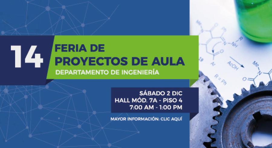 El sábado 2 de diciembre desde las 7:00 a.m., en el Hall del módulo 7A, 4° piso, se realizará la "14ª versión de la Feria de Proyectos de Aula" de los programas adscritos al Departamento de Ingeniería (Ingeniería Química, Ingeniería de Alimentos, Ingeniería de Sistemas, Ingeniería en Automatización y la Tecnología en Robótica y Automatización Industrial). Los estudiantes participantes de los proyectos seleccionados podrán inscribirse a través de Avata máximo hasta el día jueves 30 de noviembre.