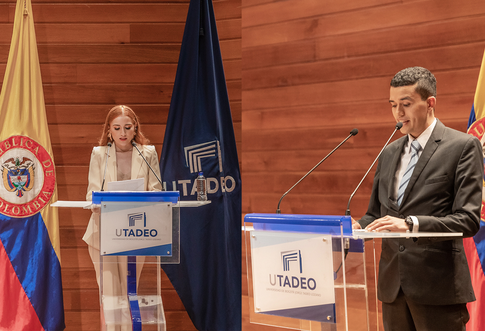 María José León y Hernán David Araque fueron los graduandos que hablaron en representación de los estudiantes. Agradecieron a los profesores y directivos por su apoyo en el paso por la Universidad. Recordaron momentos inolvidables, en donde cumplieron sus expectativas y catapultaron sus sueños profesionales. “Quiero que celebremos juntos este logro que se suma a nuestras vidas, celebrar esos momentos en los que vencimos la adversidad y demostramos que somos capaces de lograr las metas que un día nos propusimos”, destacó María José.