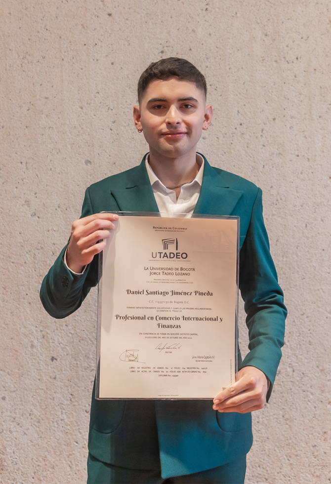 Daniel Santiago Jiménez, profesional en Comercio Internacional y Finanzas, expresó la felicidad que siente junto a su familia por la culminación de esta etapa. “Estudiar una carrera conlleva mucho sacrificio y esfuerzo, y recoger los frutos me hace muy feliz. Siento que la universidad me brinda todas las herramientas para crecer. Ya estoy en mi primer empleo y estoy dispuesto a empezar a crecer en este nuevo camino”.