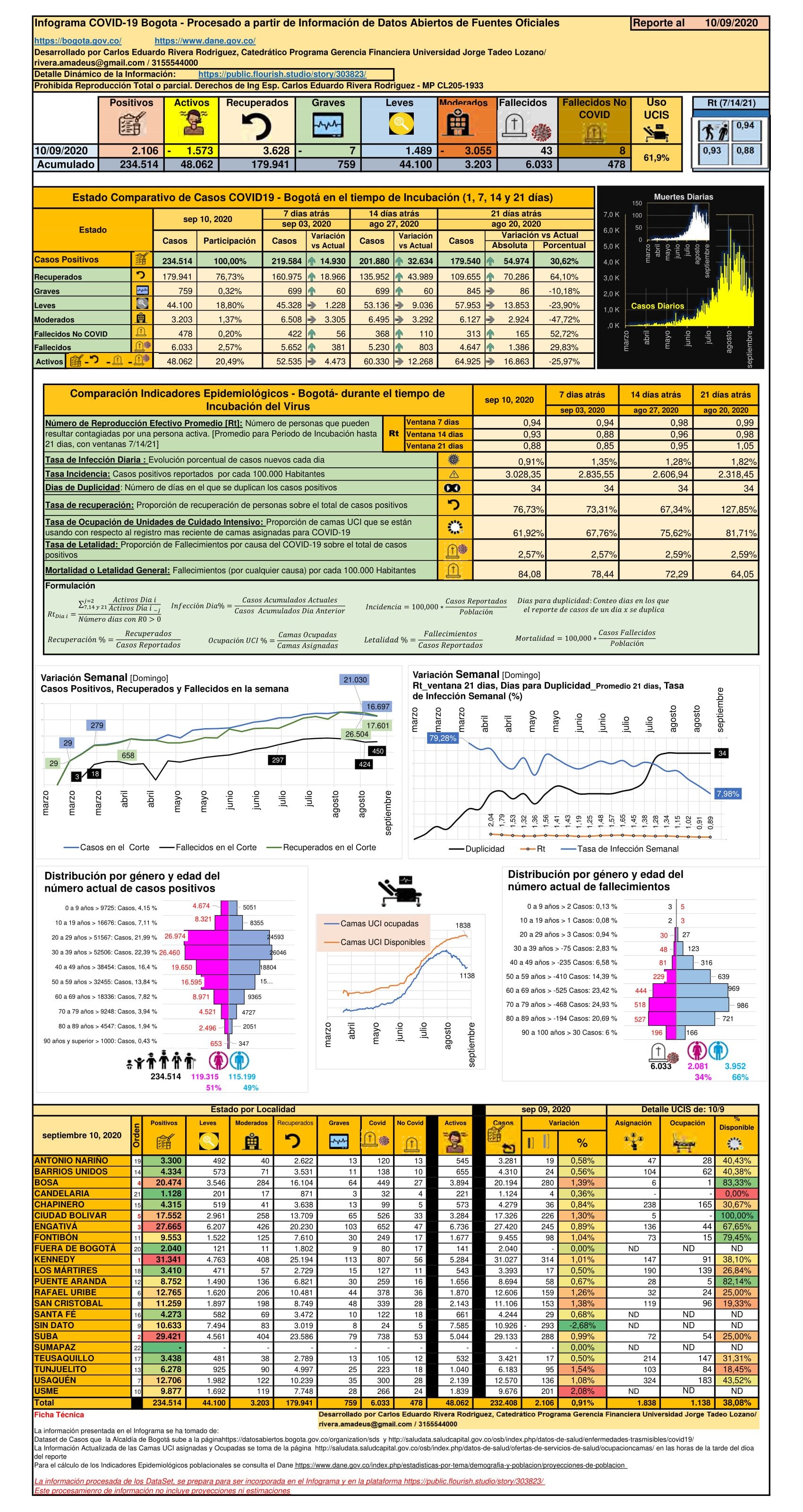 • Bogotá, al 10 de septiembre, alcanzó la cifra de 234.154 casos positivos (14.930 en la semana), 48.062 casos activos; con una tasa de recuperación del 76,73%, se ha llegado a 179.941 personas recuperadas (18.966 en la semana) y han fallecido 6.033 personas (381 en la semana).