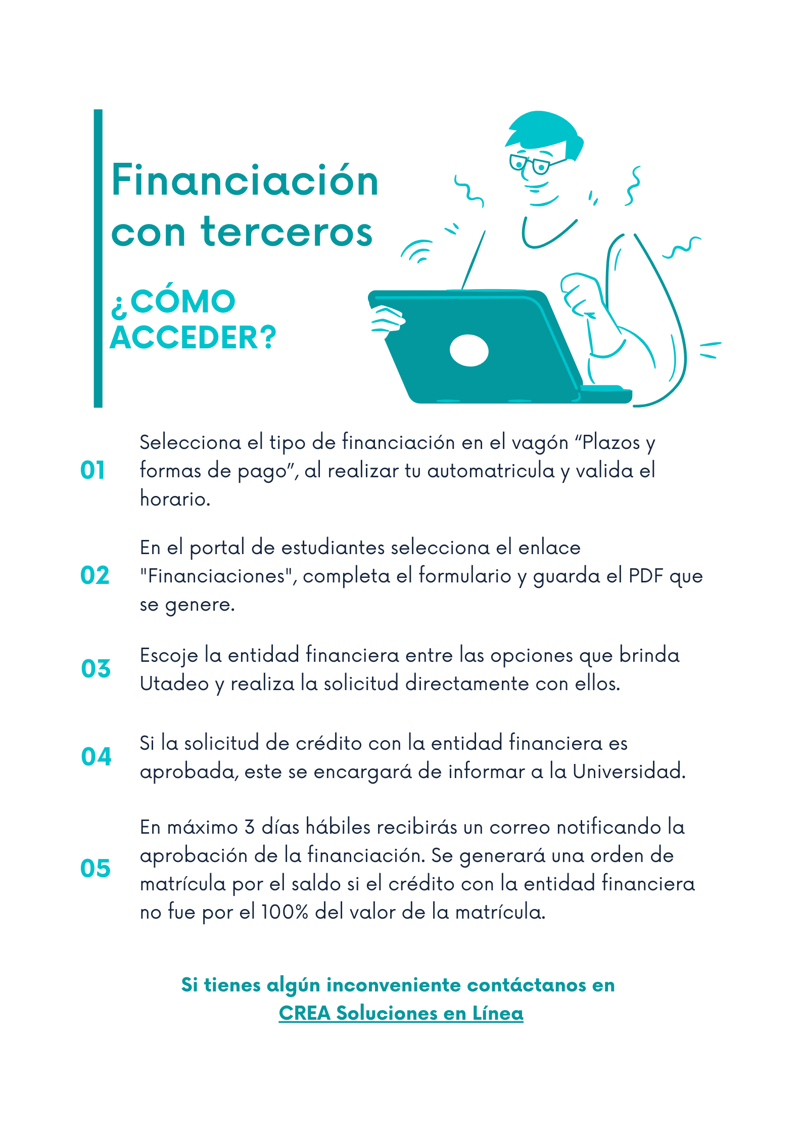 Teniendo en cuenta la coyuntura actual y con el fin de evitar los desplazamientos por la ciudad, los estudiantes tadeístas desde ahora podrán realizar los trámites de Apoyo Financiero virtualmente. En este sentido, la Universidad ha establecido una serie de pasos y canales según el tipo de financiación que el estudiante elija: Corto Plazo, ICETEX, Terceros (Entidades financieras).