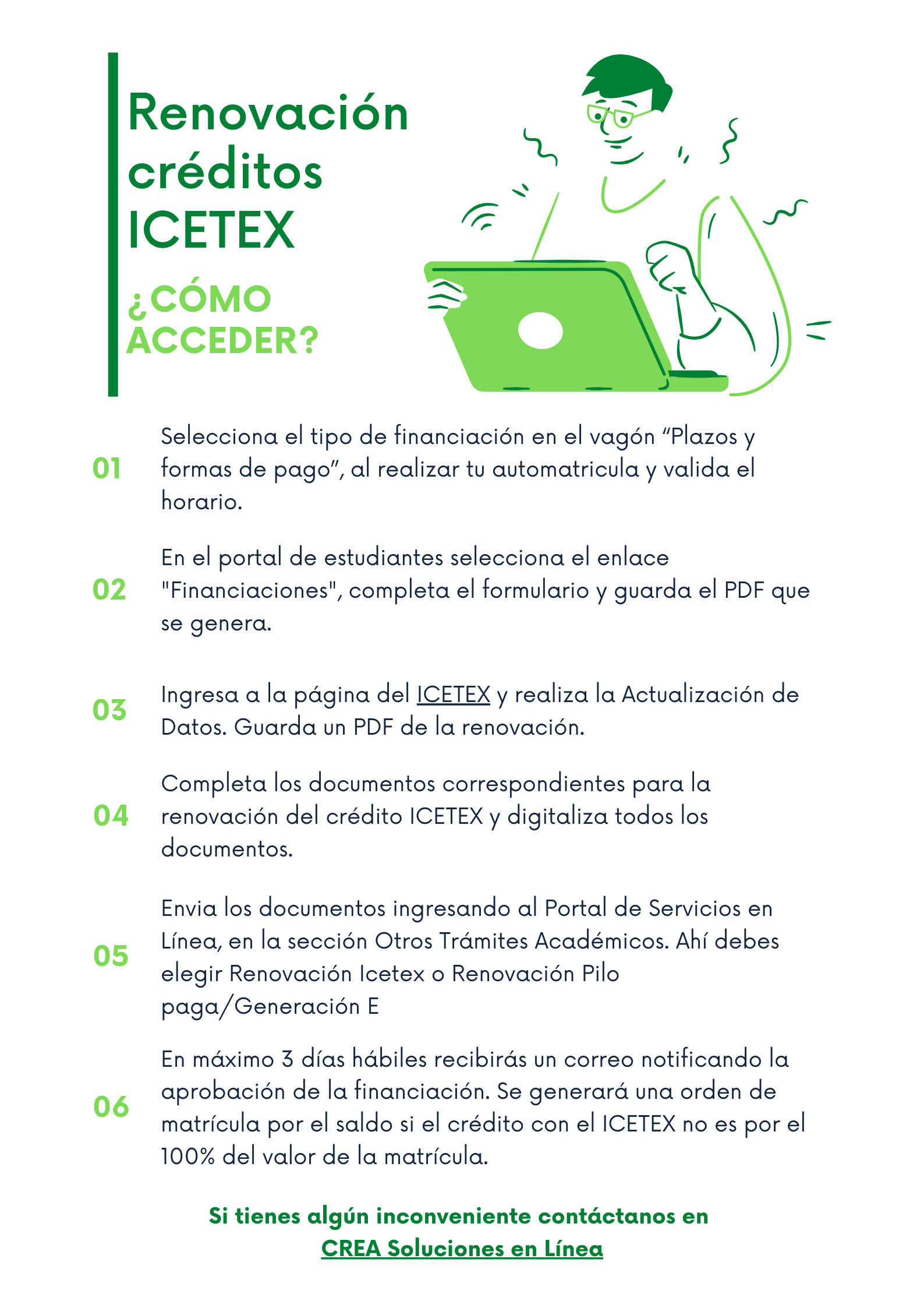De acuerdo con la Coordinadora de la Oficina de Apoyo Financiero, Carolina Prieto, se dispone de la totalidad de los asesores, quienes estarán atentos para prestar la asesoría a todos los estudiantes, en los tiempos establecidos. Se mantendrán los canales de atención institucionales como el correo, CREA Soluciones en línea y el número telefónico 2427030, opción #3. Además, se ha habilitado un chat y la atención por medio de videollamadas. “Por todos los canales estaremos prestos a brindar el apoyo que necesite el estudiante”, comenta Prieto.